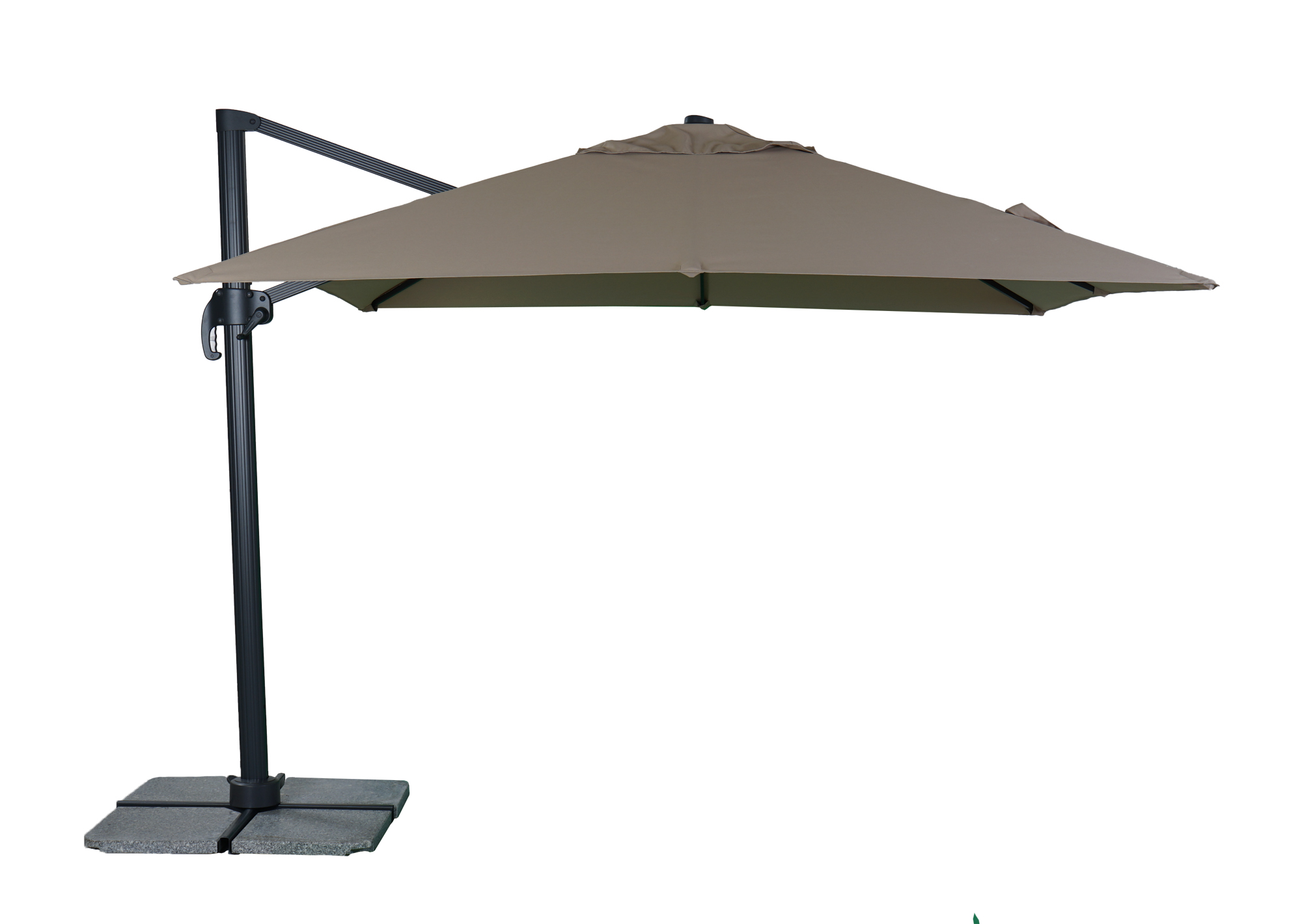 Med hjälp av en pedal vid foten kan parasollet rotera runt sin egen axel och man kan på så sätt följa solens gång.