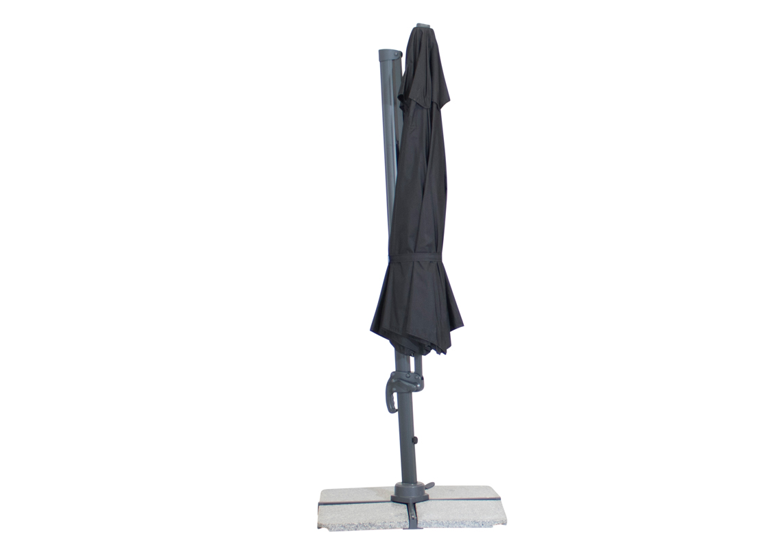 Sky är ett mycket praktiskt och bra ampelparasoll. Vinkeln går enkelt att justera med hjälp av handtaget som skjuts upp och ner längs stången. Tack vara att parasollet är väl balbanserat så krävs inte mycket kraft för att föra handtaget upp och ner längs sidan. Det är också med hjälp av handtaget och veven som man fäller upp och ner parasollet.