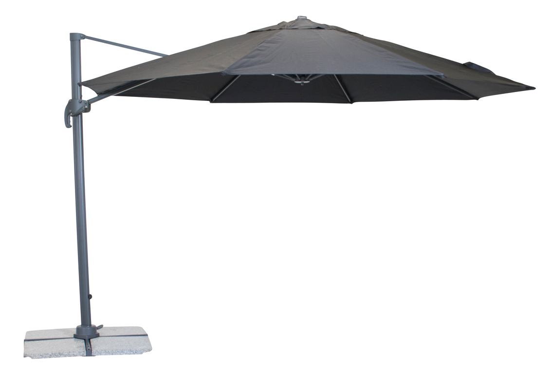 Med hjälp av en pedal vid foten kan parasollet rotera runt sin egen axel och man kan på så sätt följa solens gång.