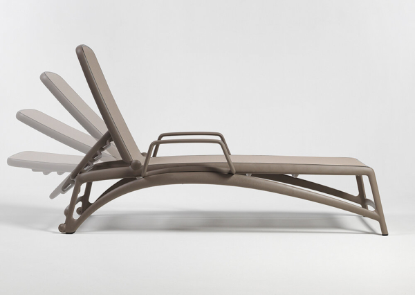 Solsäng gjord i tålig plast. Går att stapla och har hjul där bak så att den enkelt går att förflytta. Det går att välja om man vill köpa till armstöd eller inte. Solsängen går att göra helt platt.