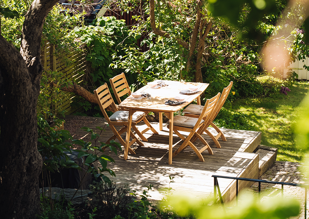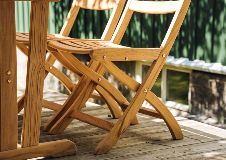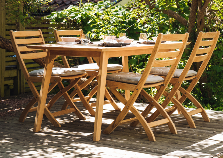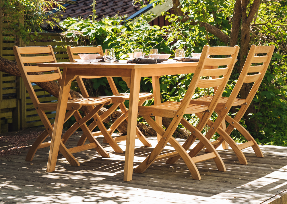 Trevlig teakgrupp f�r 4 personer med stolar u tan armst�d som g�r att du lite enklarte f�r plats p� en mindre altan eller balkong. Det g�r att f� plats n�gra till om man vill runt bordet. Dynor finns i flera f�rger. Den h�gklassiga teaken �r obehandlad vid leverans. Du v�ljer sj�lv om du l�ter den bli vackert ljusgr� eller om du oljar in.