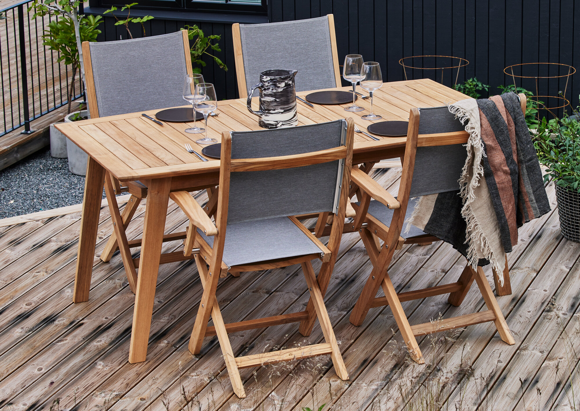 Ett mycket elegant bord med två iläggskivor för att skapa maximalt med plats. Bordet har benen en bit in vilket gör att du med lätthet kan sitta runt hela bordet utan att benen är ivägen . Bordet har en fasad kant vilket ger ett smäckert och arbetat intryck. Teaken är av högsta kvalitet.