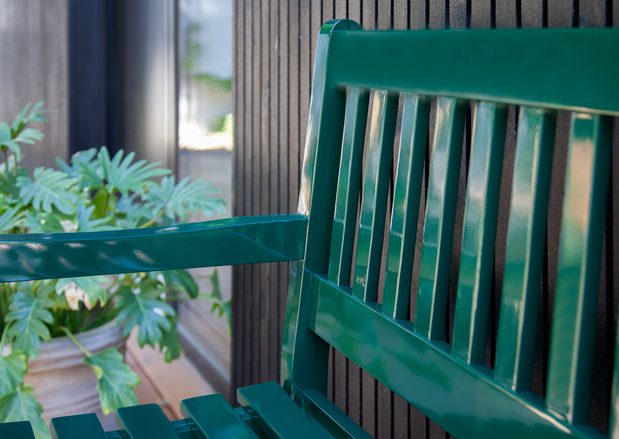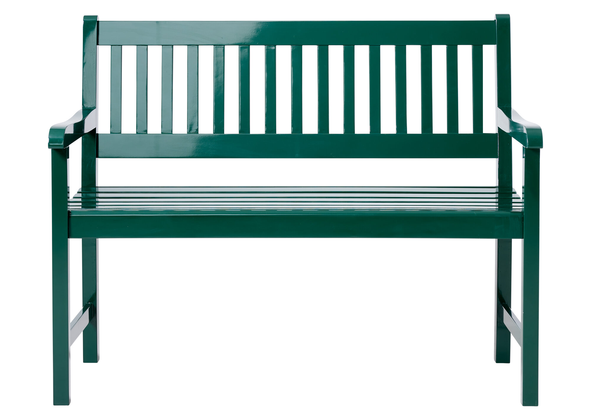Blanklackad trädgårdssoffa i mörkt grön. Gjord i mahogny som är ett hårt träslag som lämpar sig väl att lacka på.