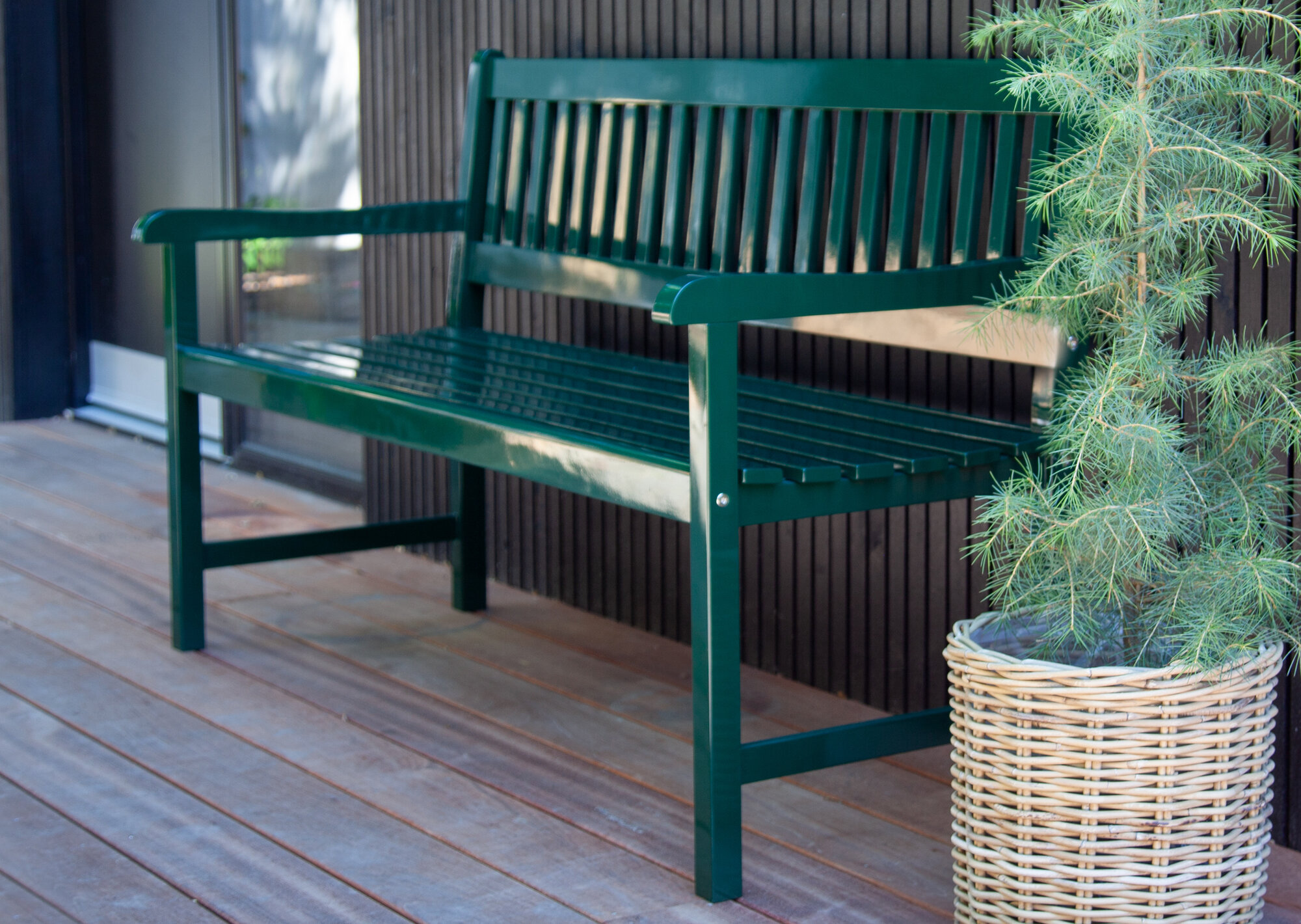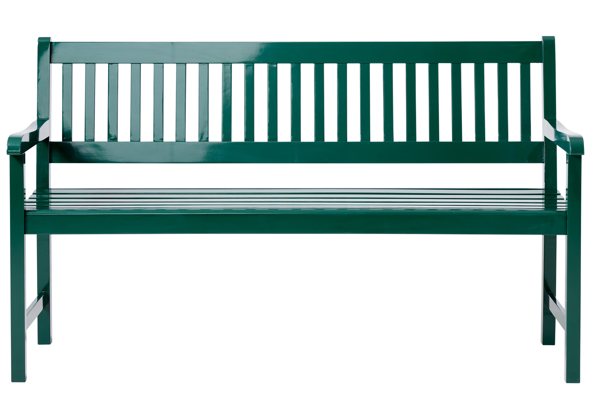 Blanklackad trädgårdssoffa i mörkt grön. Gjord i mahogny som är ett hårt träslag som lämpar sig väl att lacka på.