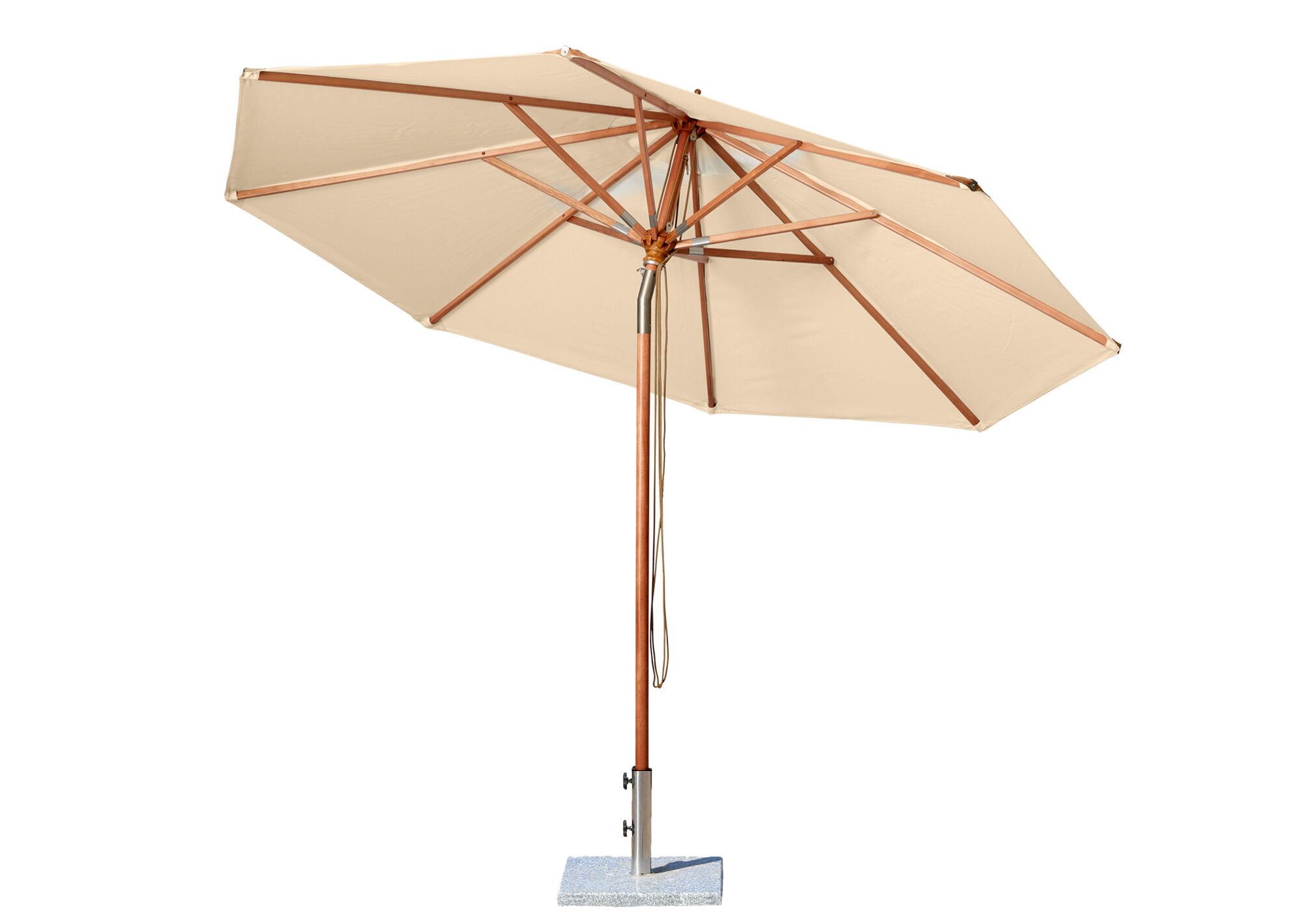 Ett praktiskt och snyggt parasoll i polyestertyg. En gedigen och välbeprövad parasollkonstruktion. Vinklingsbar i två lägen + horisontellt, parasollet vinklas genom att rotera toppen. Stocken är av brunt trä. Stolpen är 48 mm bred och tillverkad med hardwood.