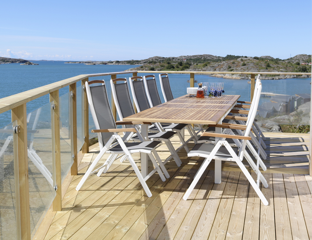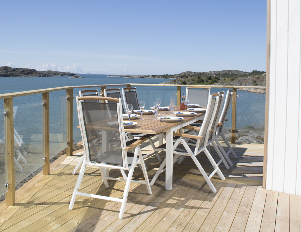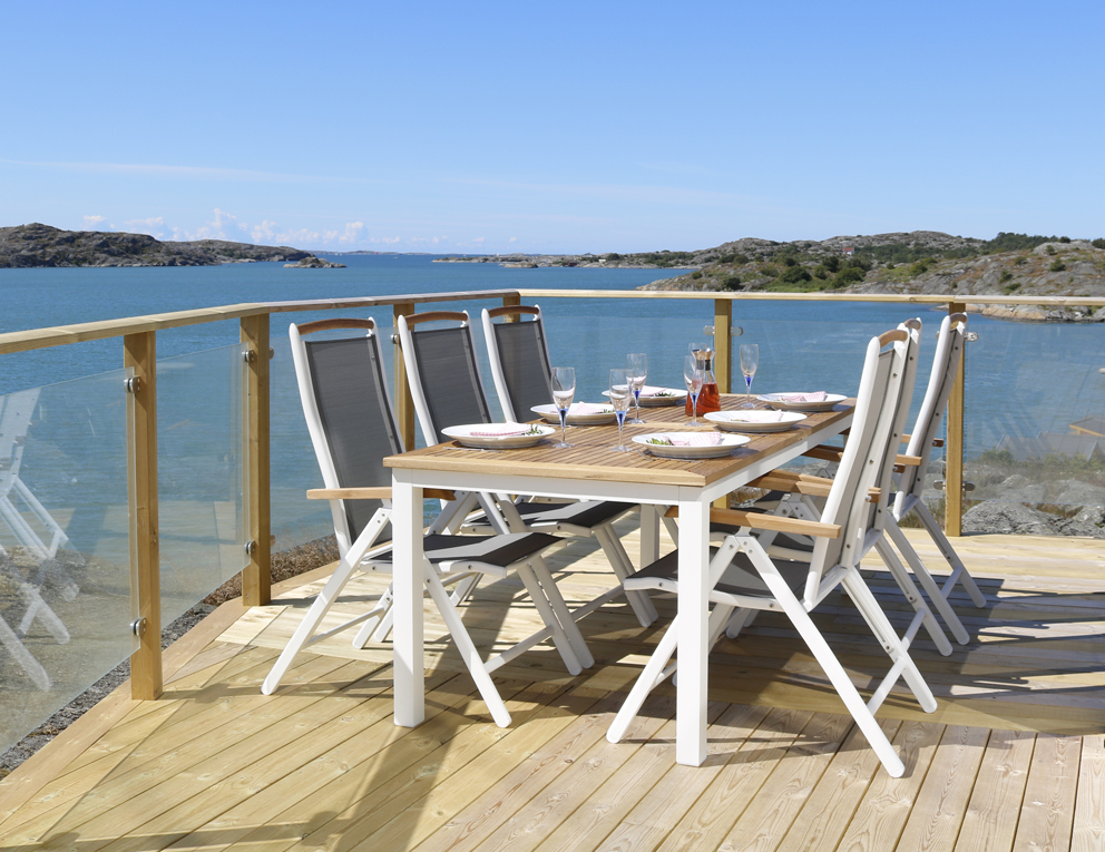 Chicago ger dig möjligheten att sitta allt från 6 till 12 personer runt bordet. Med de två förlängningsskivorna får du en stor flexibilitet. Teak i skivan och aluminium i ramen ger dig ett bord med lågt underhåll. Här med en numera klassisk positionsstol i aluminium. Stolen ger dig komfort samtidigt som den är enkel att fälla ihop när det behövs.