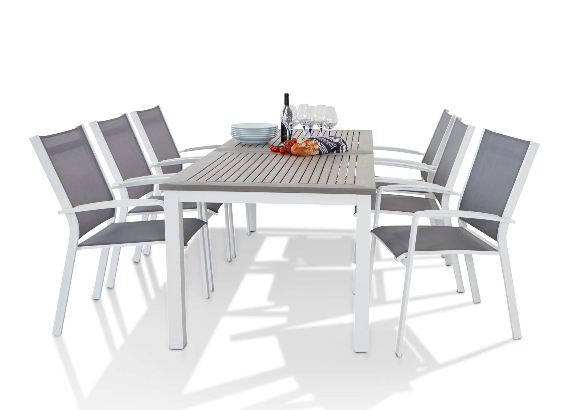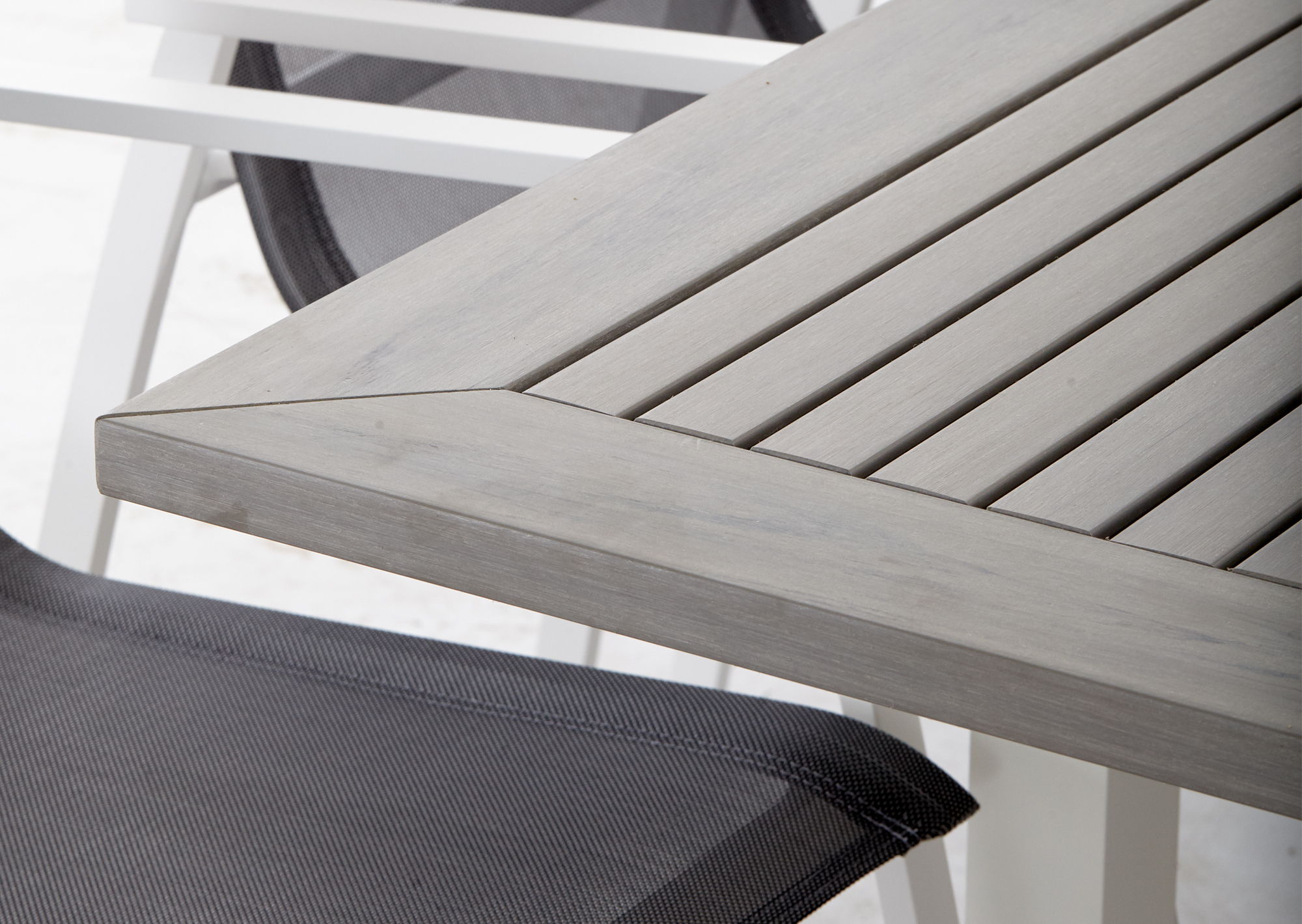 Vi kombinerar här med bekväma och eleganta Vouge karmstol i aluminium och sits och rygg i textelenväv. Den mjuka väven gör att det går utmärkt att sitta i utan dyna, men för en lite mer ombonad känsla så har vi ett antal dynor som passar bra till stolen.