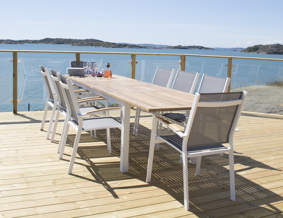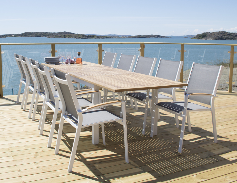 Chicago ger dig möjligheten att sitta allt från 6 till 12 personer runt bordet. Med de två förlängningsskivorna får du en stor flexibilitet. Teak i skivan och aluminium i ramen ger dig ett bord med lågt underhåll. Med den stilrena och mycket sittvänliga Vouge karmstolen får du en perfekt matgrupp för lediga stunder.