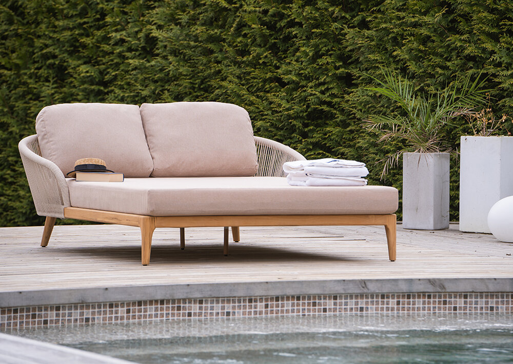 En riktigt maffig dagbädd att krypa upp i och bara vara. Stommen är gjord helt i teak och ryggstödet är av tåligt rep som kan stå emot vädrets makter.
