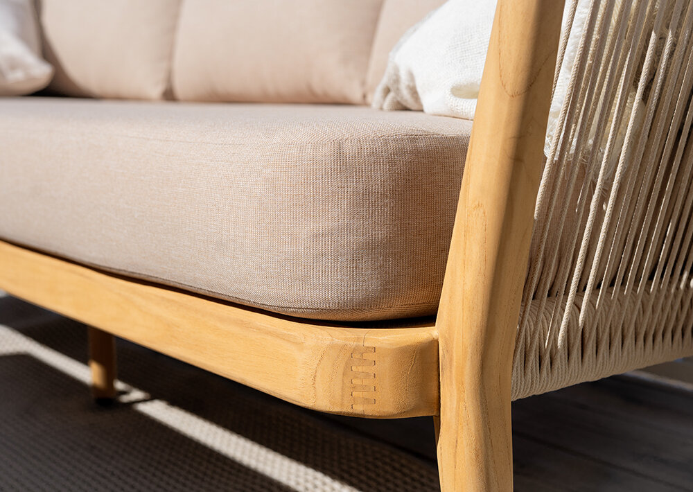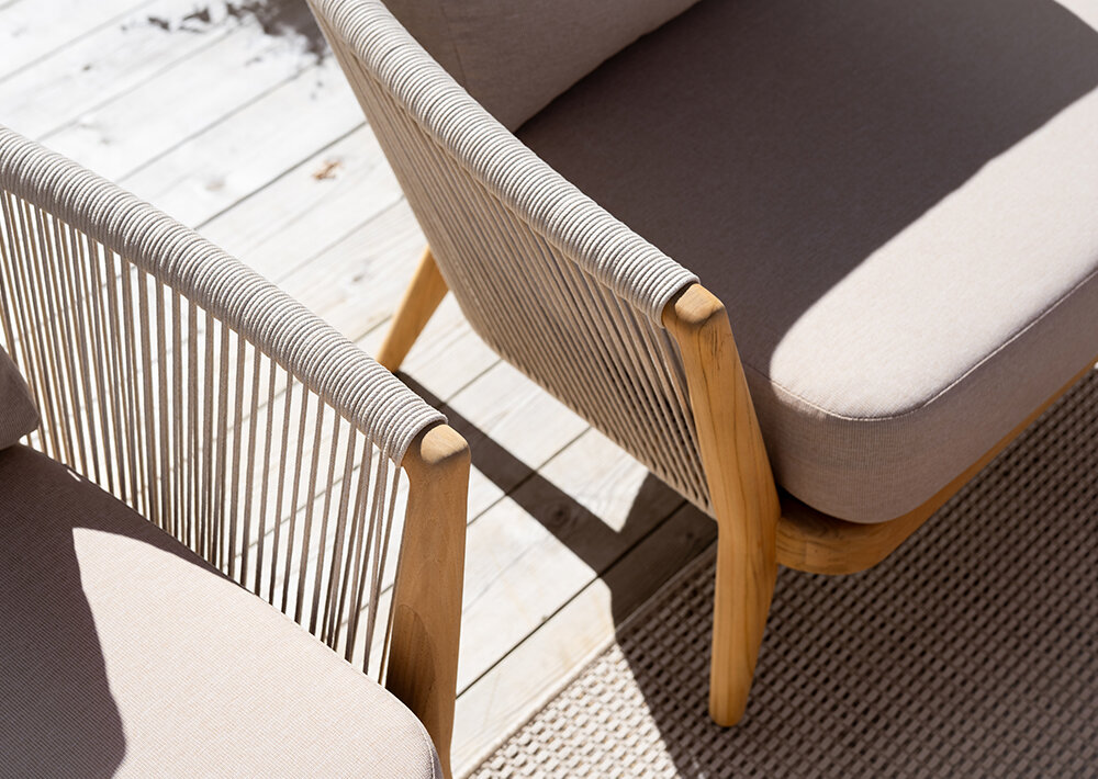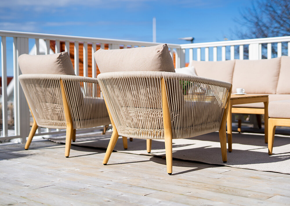 En härlig serie med stomme av teak och rygg / armstöd i tåligt rep som klarar väder och vind på ett utmärkt sätt. Teaken kan du välja om du vill olja in eller låta bli vackert grå genom att endast tvätta den med såpa och vatten.