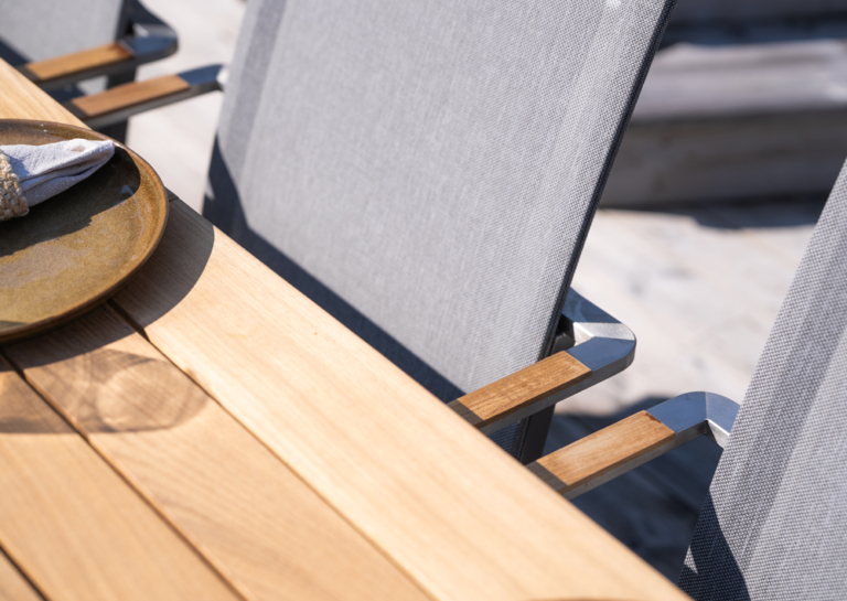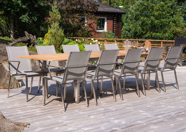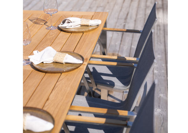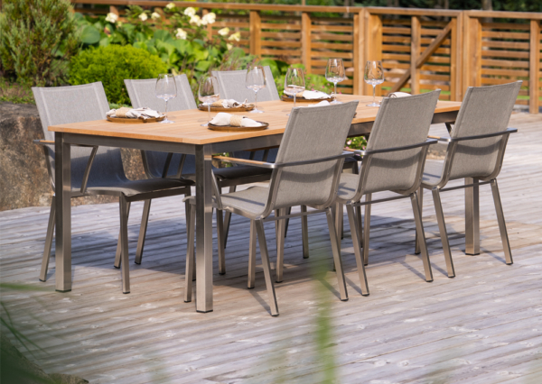 Matbord i rostfritt stål och med en skiva i teak. Det rostfria stålet säkerställer att bordet är stabilt över tid. De breda teakplankorna i bordet blir håller bra och blir vackert silvergrå om man inte oljar in dem utan tvättar av dem med såpvatten och borste en gång om året.