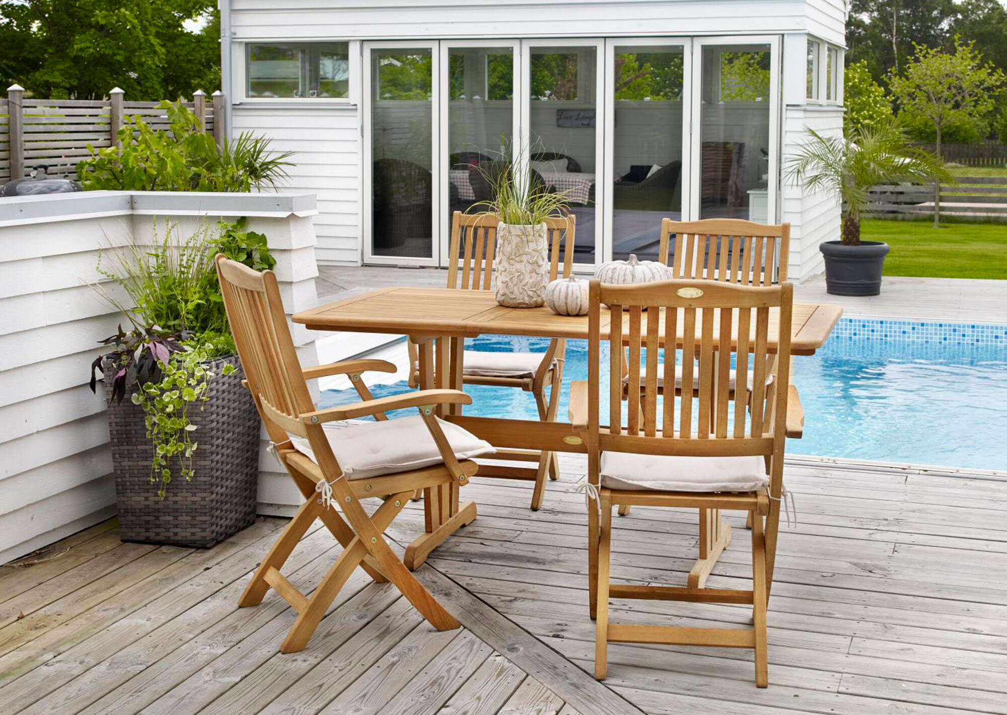 Bordet är gjort i teak vilket gör att du kan välja om du vill olja in bordet och behålla träfärgen eller om du låter vädrets makter göra trät ljusgrått. Om du oljar in det så kommer du behöva slipa bodet emellanåt då svarta fläcka uppstår om det står ute i regn. Om det inte regnar på det så är det betydligt mindre jobb med att hålla ordning på den biten och du får dessutom fördelen att inoljat trä inte får fläckar lika lätt.