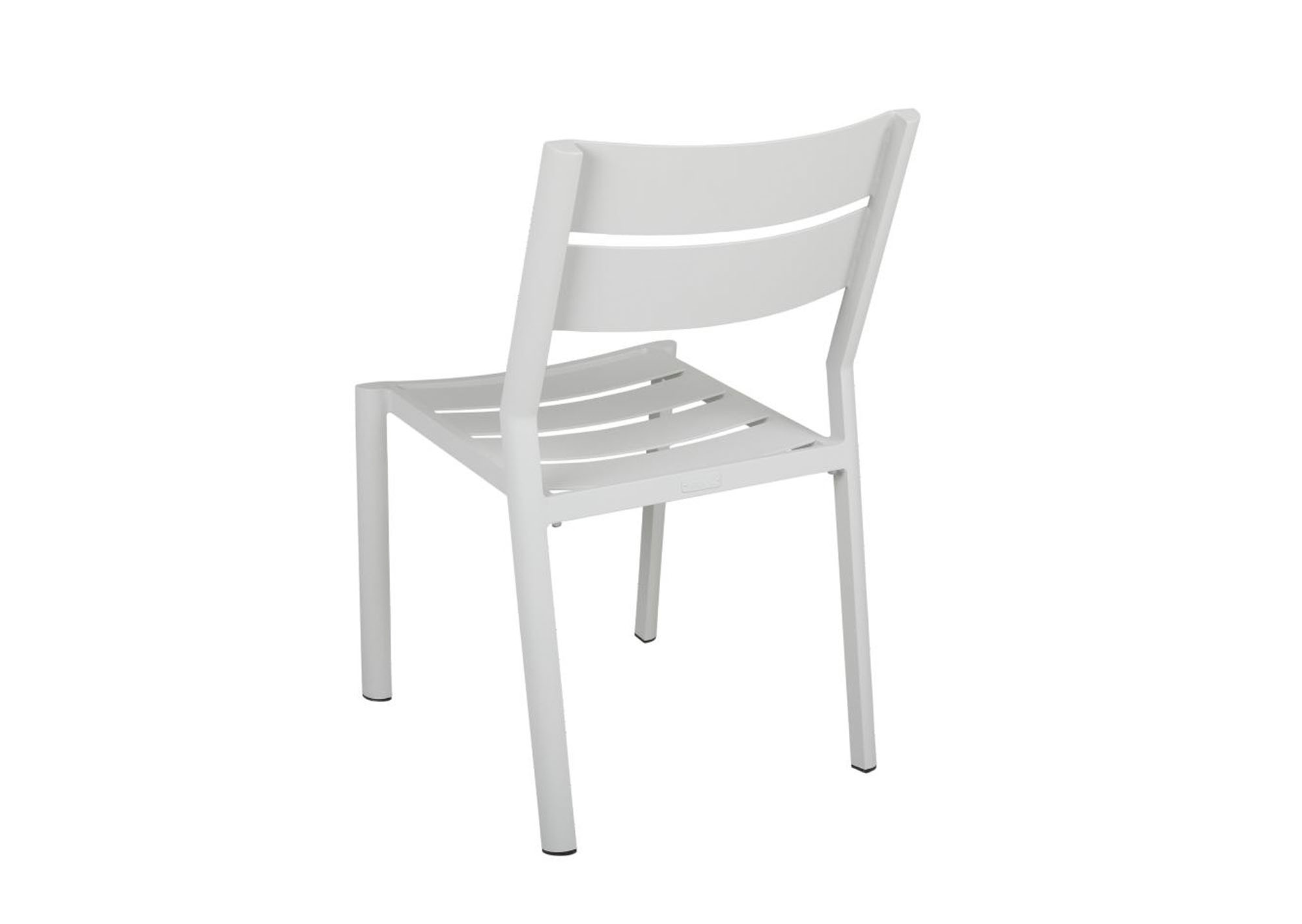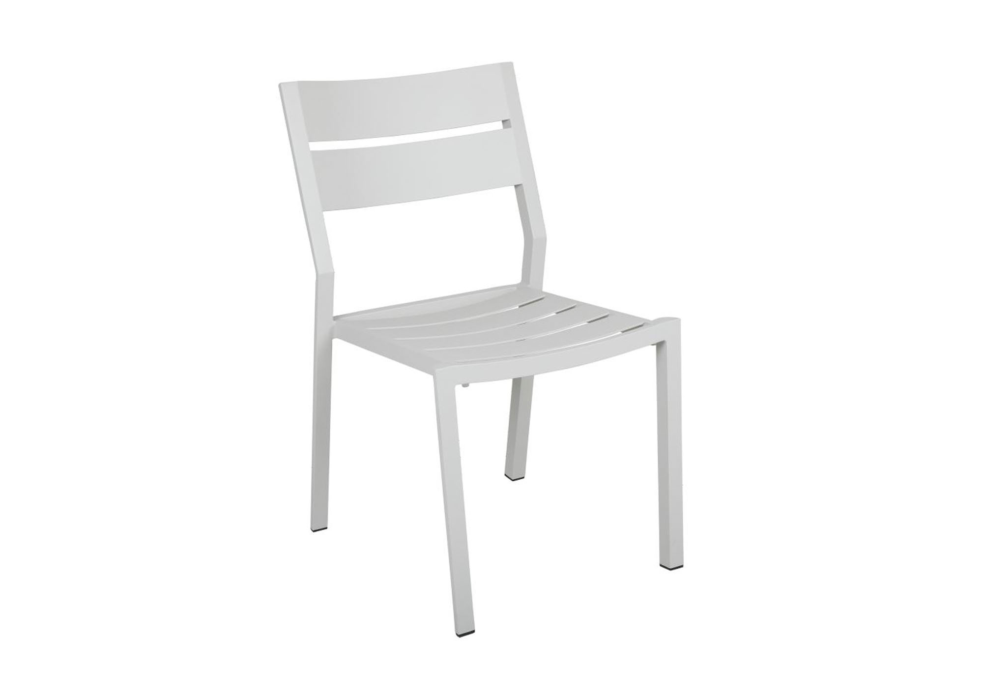 Stapelbar matstol i lackad aluminium. Underhållsfri, hållbar och bekväm.