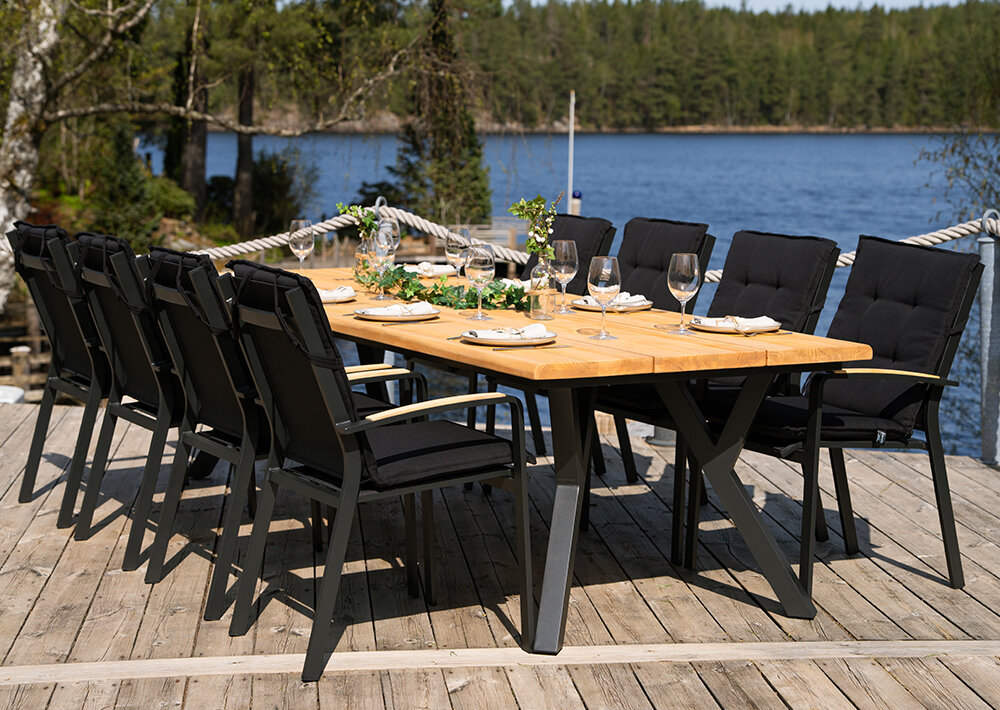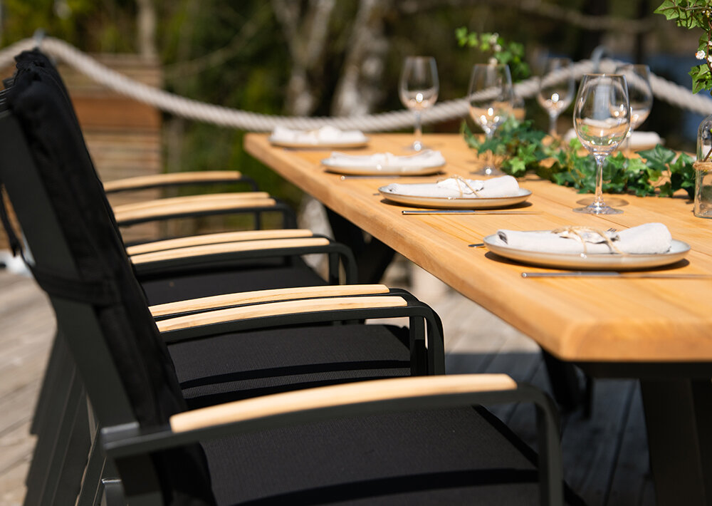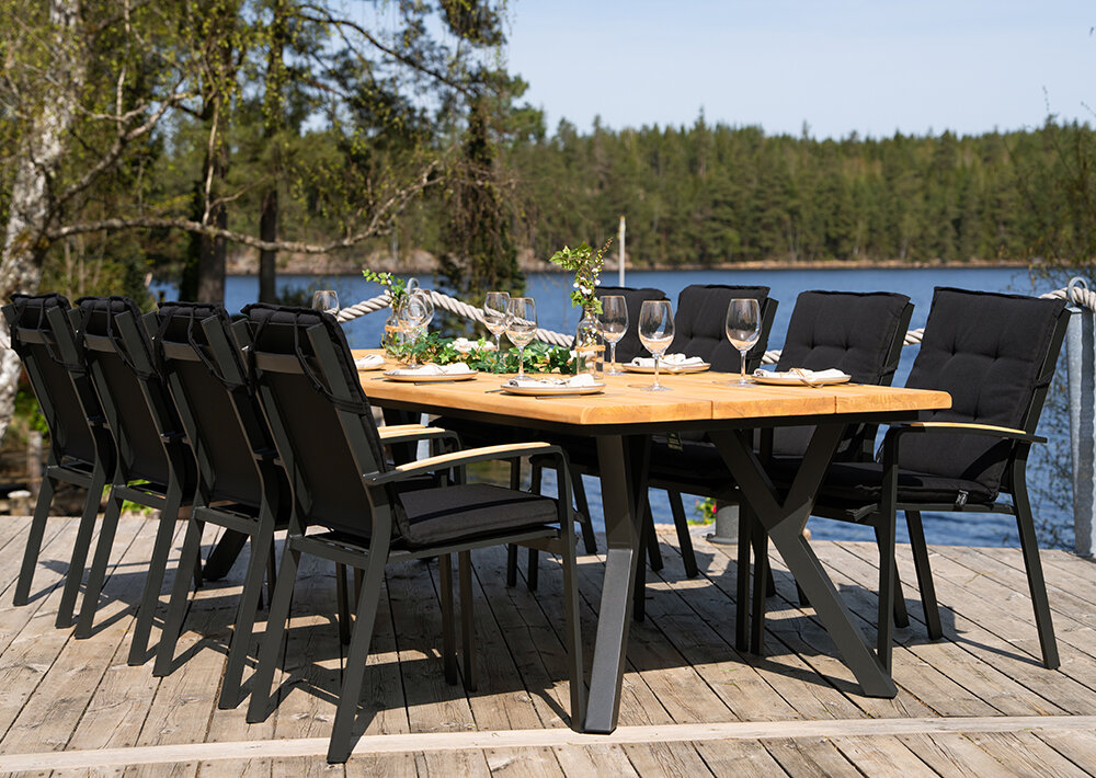 Här i kombination med bekväma Vouge karmstol i aluminium och textilen väv med armstöd i teak.