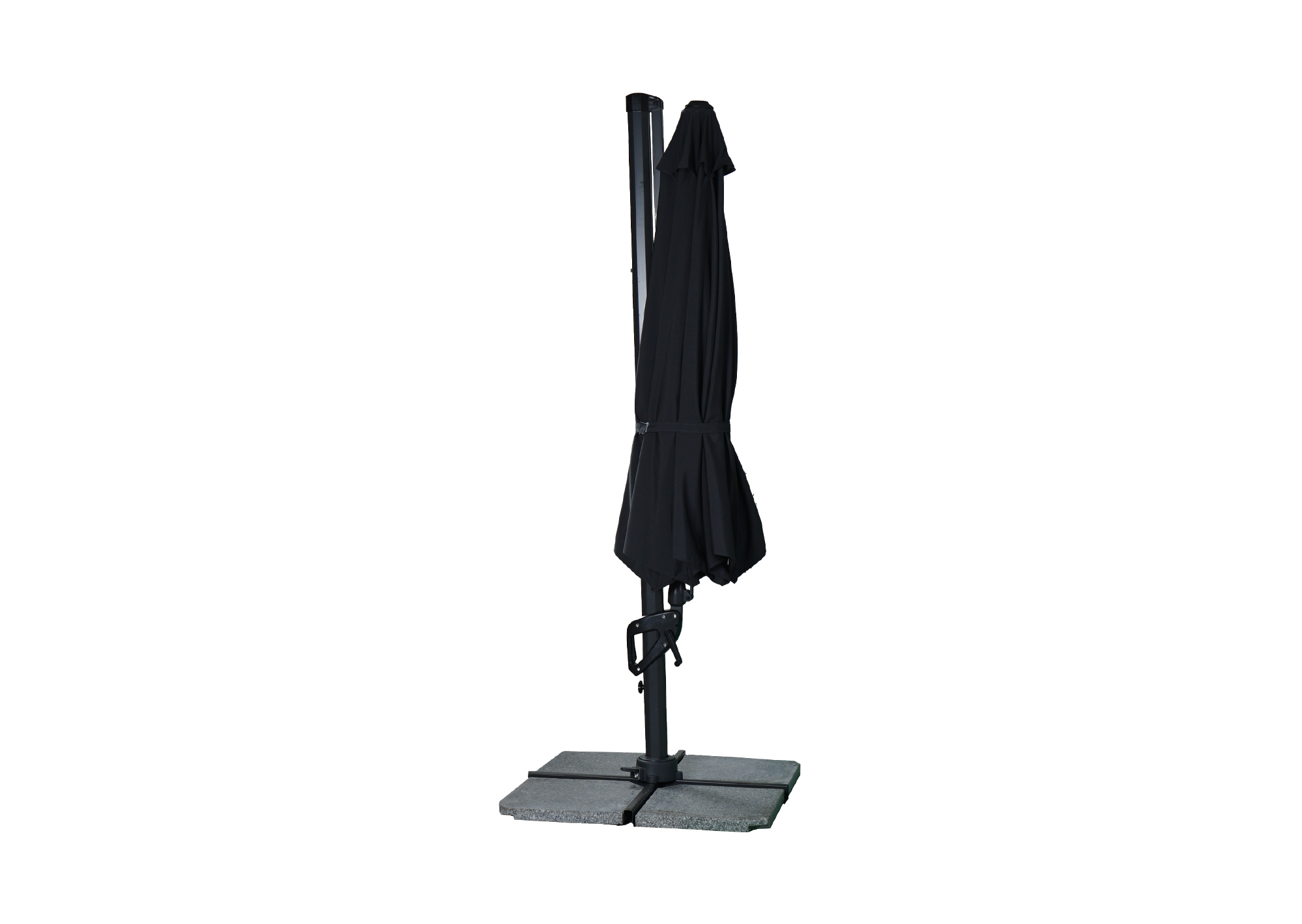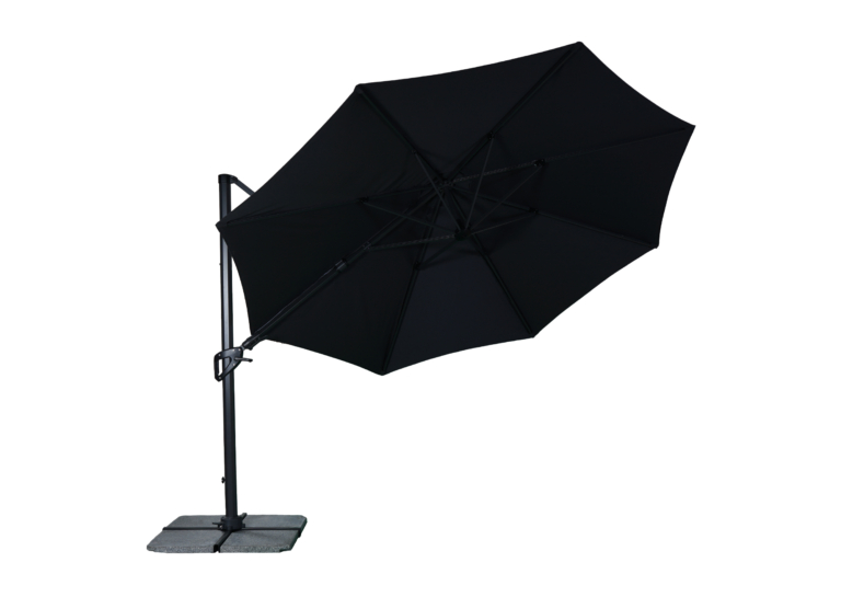 Flex är ett mycket praktiskt och bra sidohängande parasoll. Vinkeln på hängparasollet går enkelt att justera med hjälp av handtaget som skjuts upp och ner längs stången. Tack vara att parasollet är väl balbanserat så krävs inte mycket kraft för att föra handtaget upp och ner längs sidan. Det är också med hjälp av handtaget och veven som man fäller upp och ner det fritt hängande parasollet.