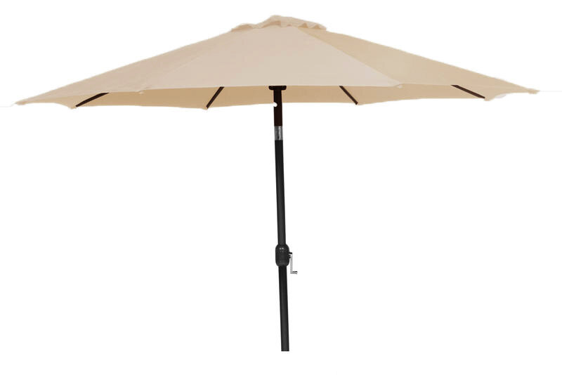 Parasoll med svart stomme av aluminium. Parasollet vinklas med hjälp av en knapp längst upp och fälls upp och ner med hjälp av en vev. Stocken är 48 mm i diameter.