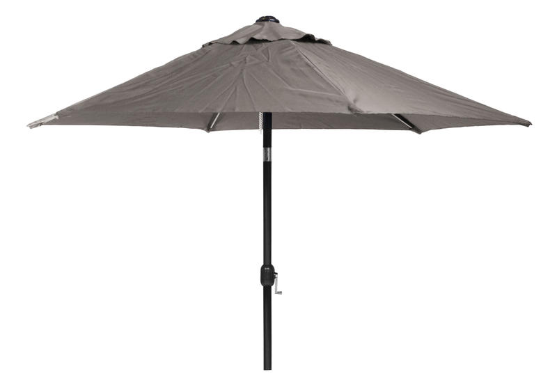 Parasoll med svart stomme av aluminium. Parasollet vinklas med hjälp av en knapp längst upp och fälls upp och ner med hjälp av en vev. Stocken är 48 mm i diameter.