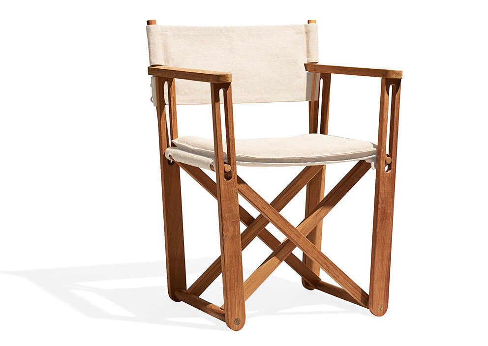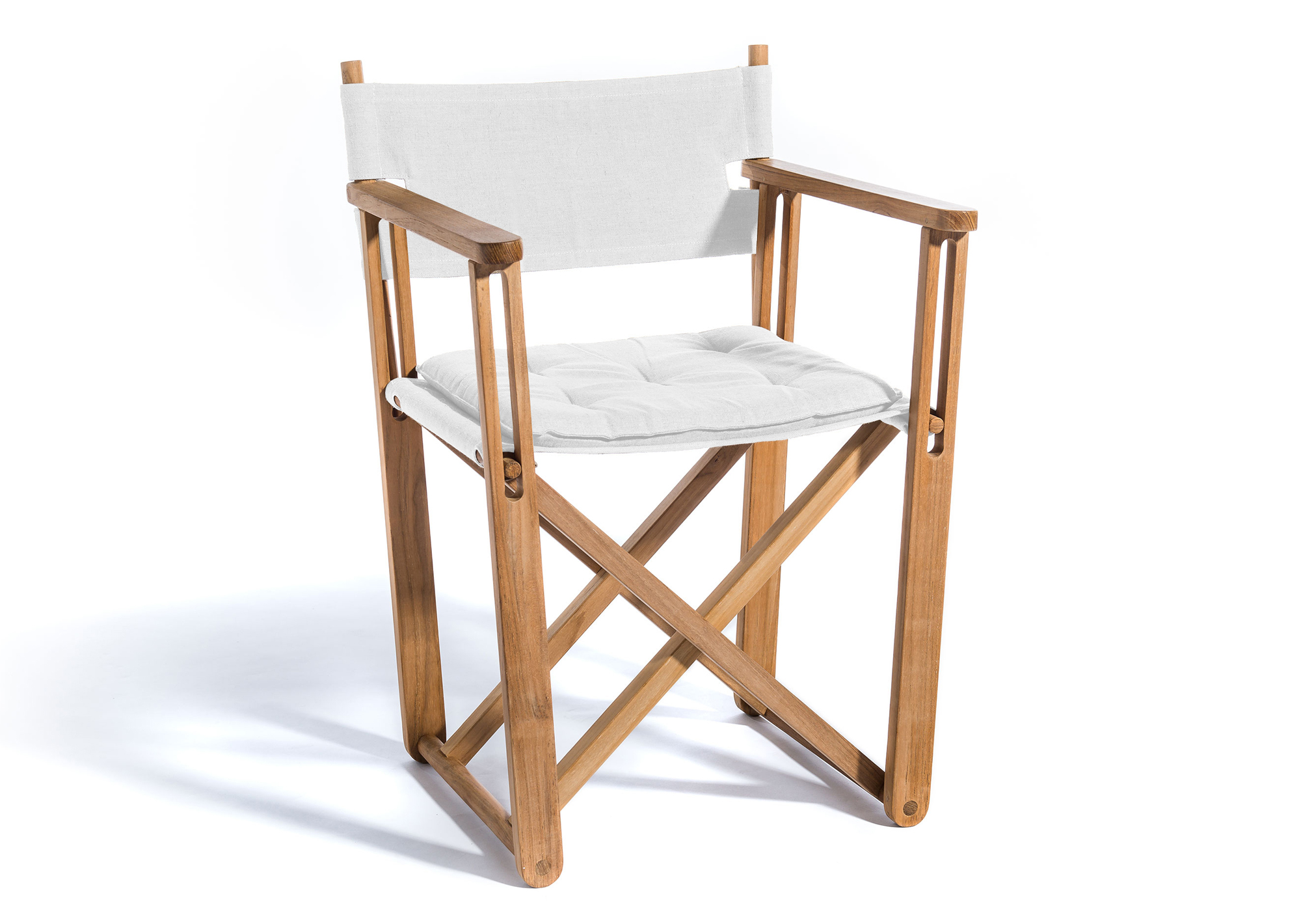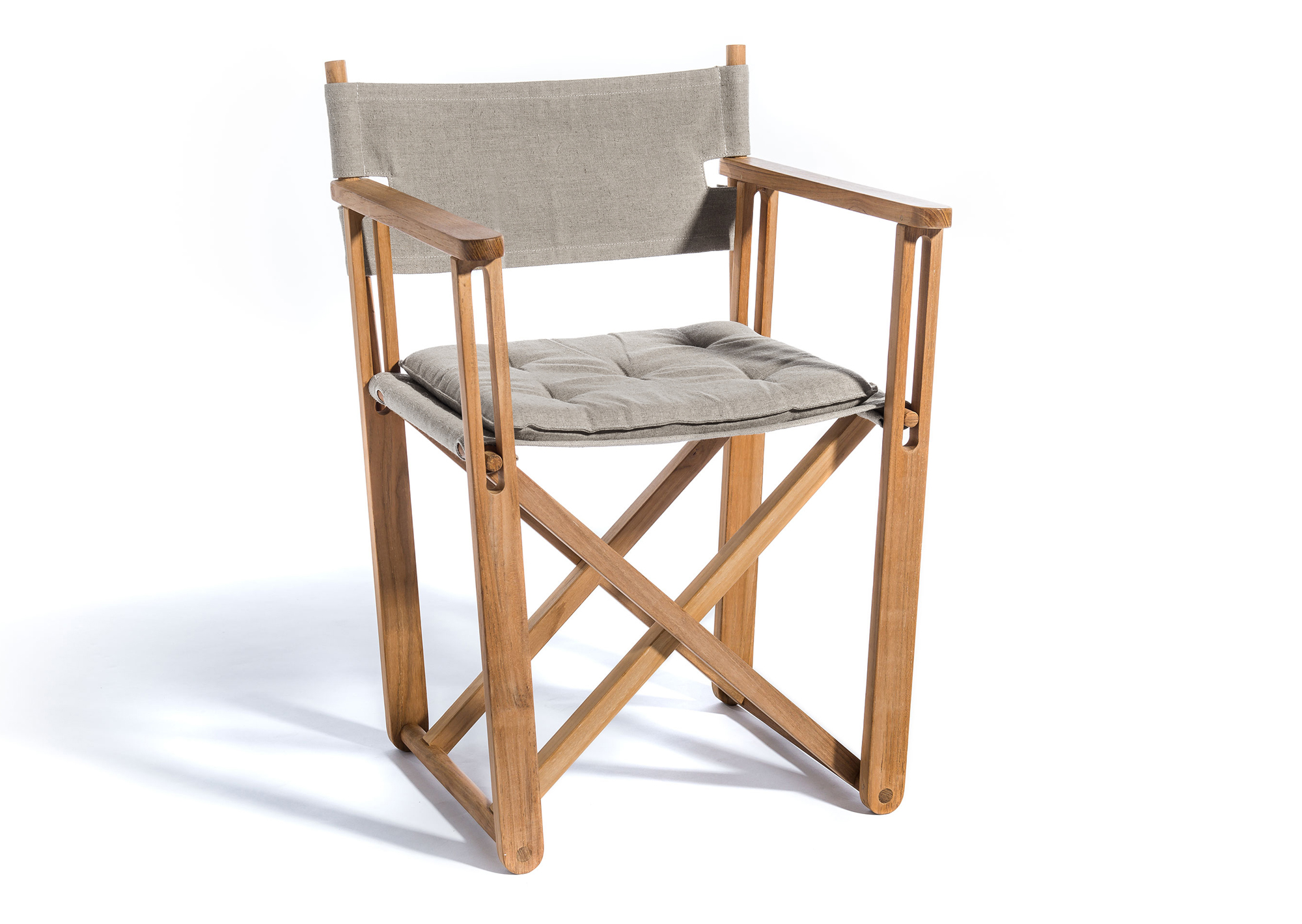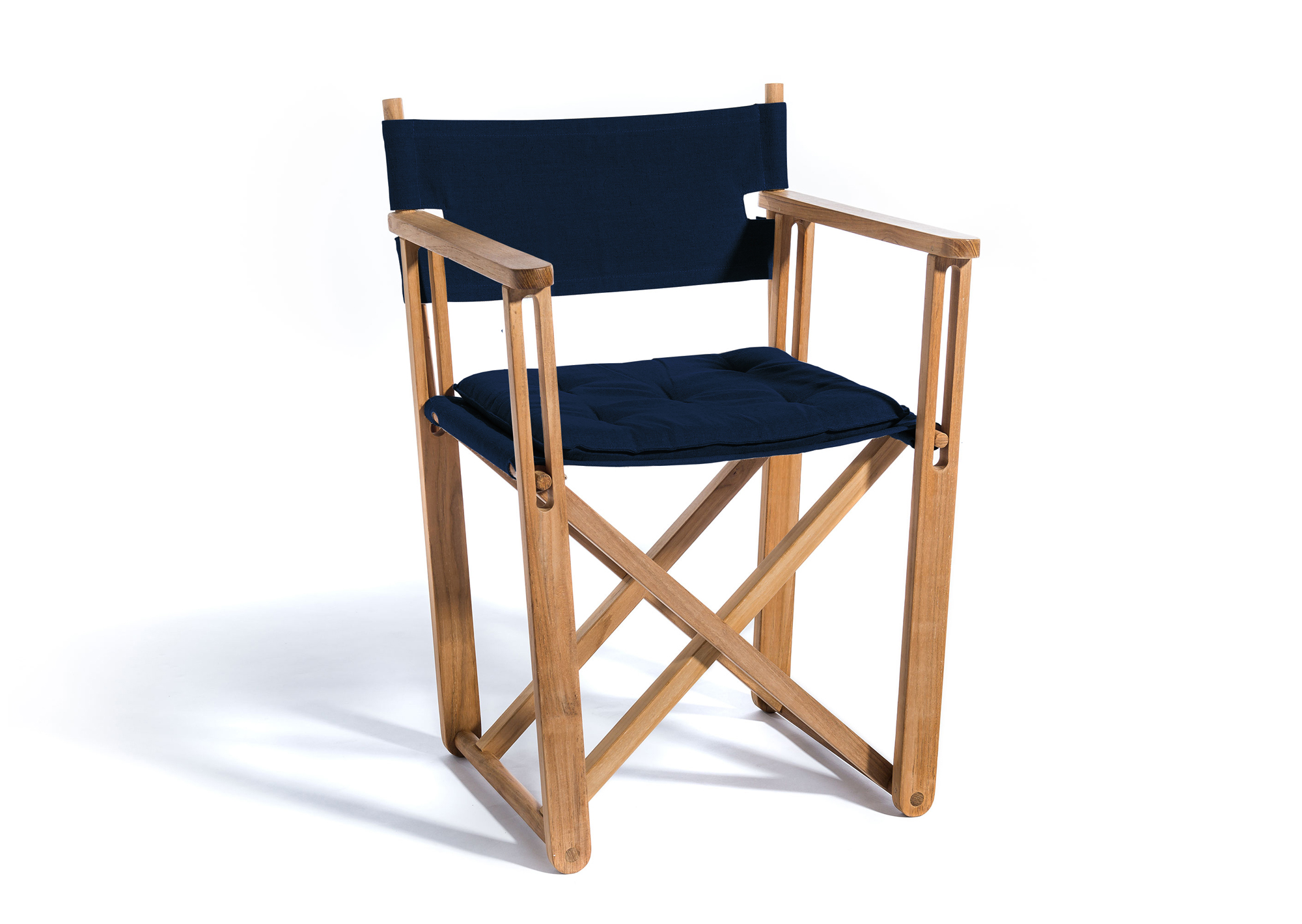 En regissörsstol med stil. Stommen är i teak och tyget är Sunbrella som är det bästa som går att få tag på för utemiljö.