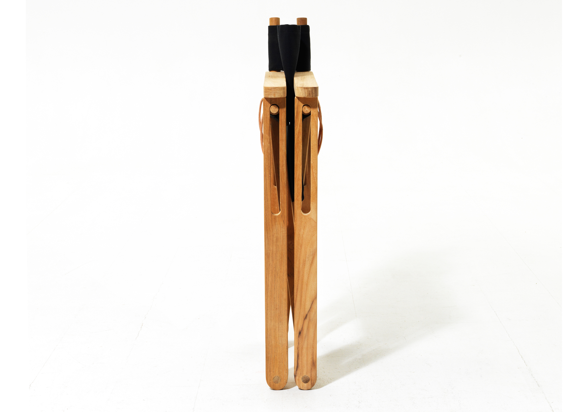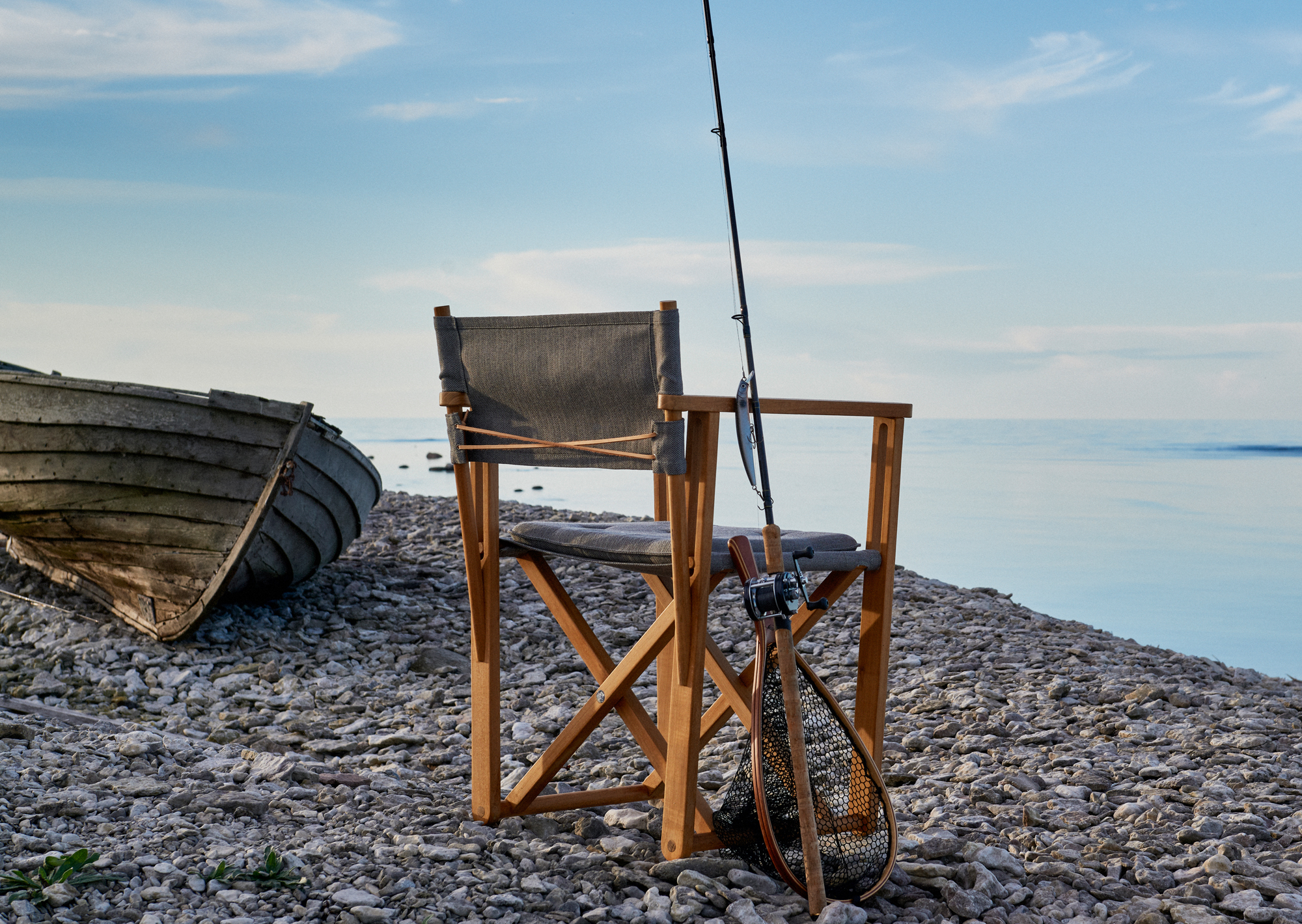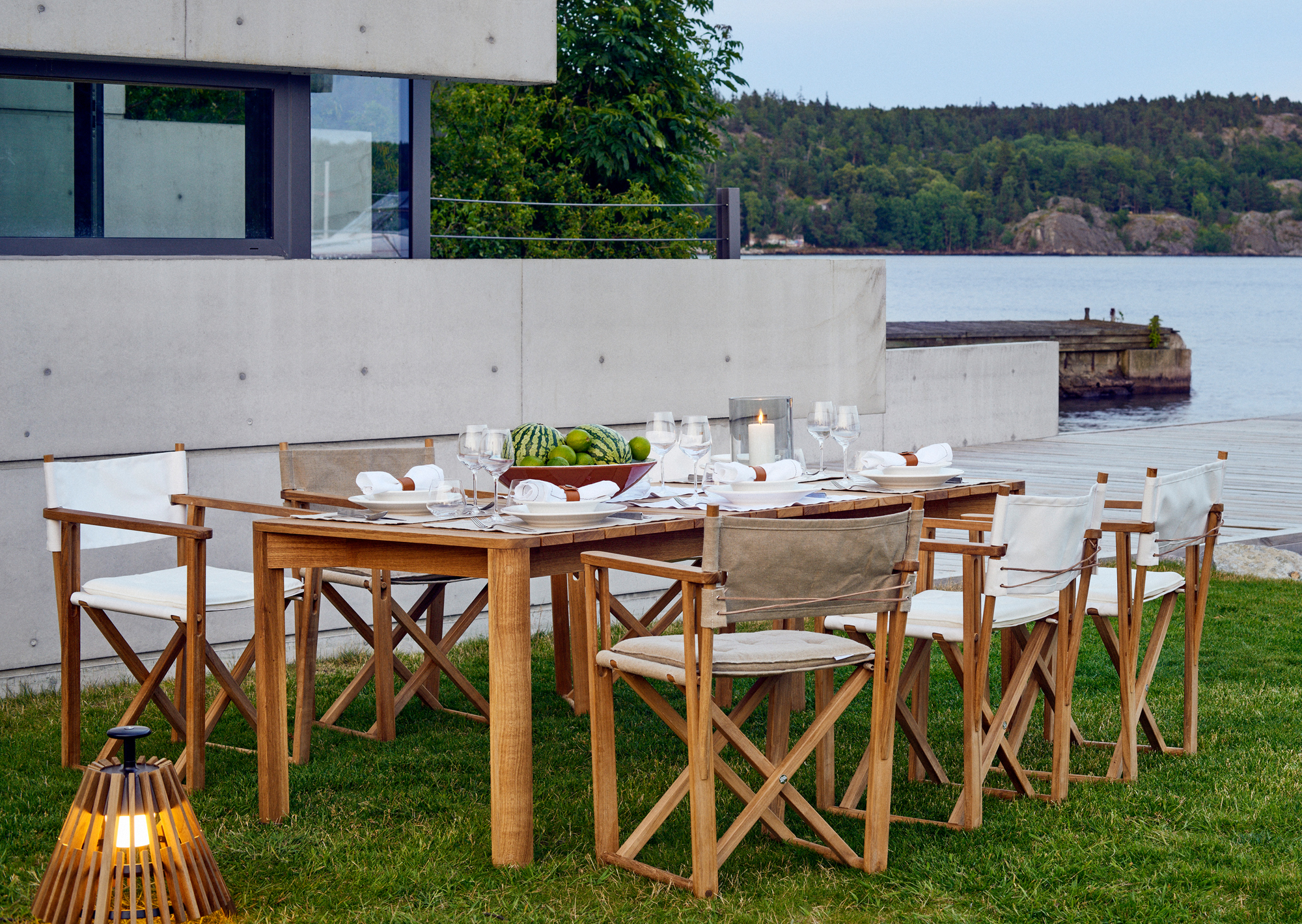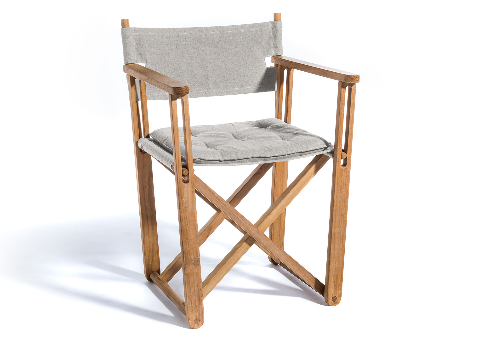 En regissörsstol med stil. Stommen är i teak och tyget är Sunbrella som är det bästa som går att få tag på för utemiljö.