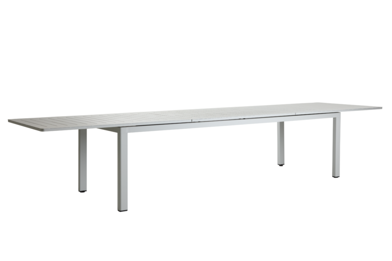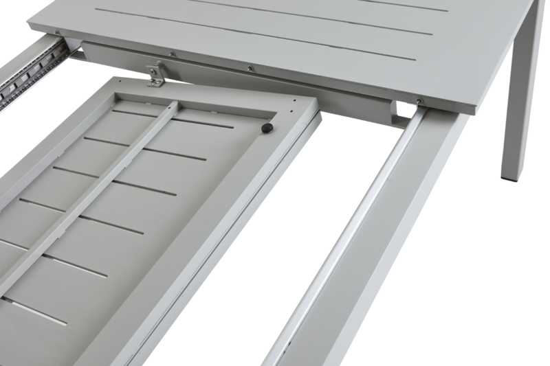 Utdragsbord i aluminium. Den kompakta skivan gör att man inte får riktigt den ”plåtiga” känslan som man normalt får från ett aluminium bord. Bordet kräver ett minimum av underhåll. Vi rekommenderar att man oljar in glidytor och gångjärn men i övrigt är det bara att hålla det rent som behövs.