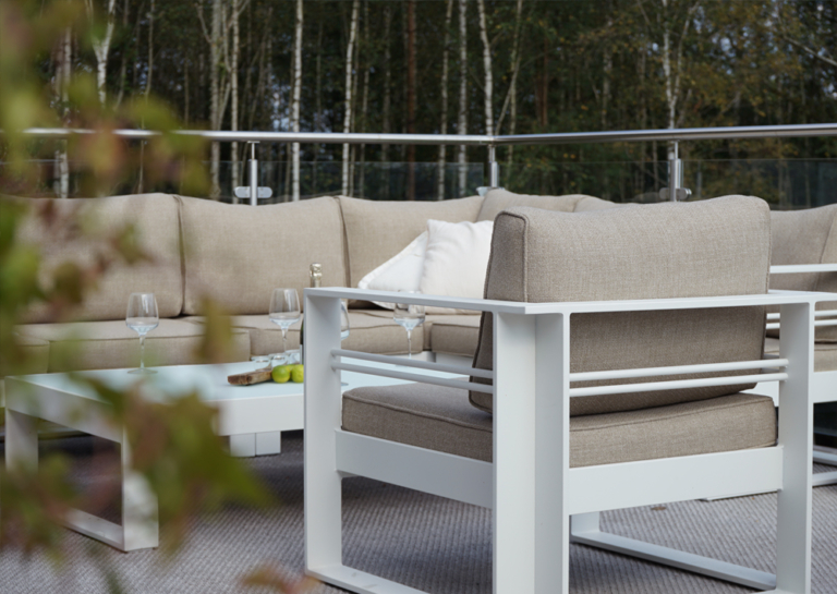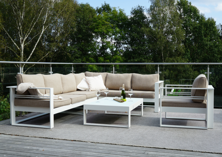 Lyxig stilren loungegrup i lackad aluminium. En rejäl grupp med väl tilltagna dimensioner för en mycket god sittkomfort.