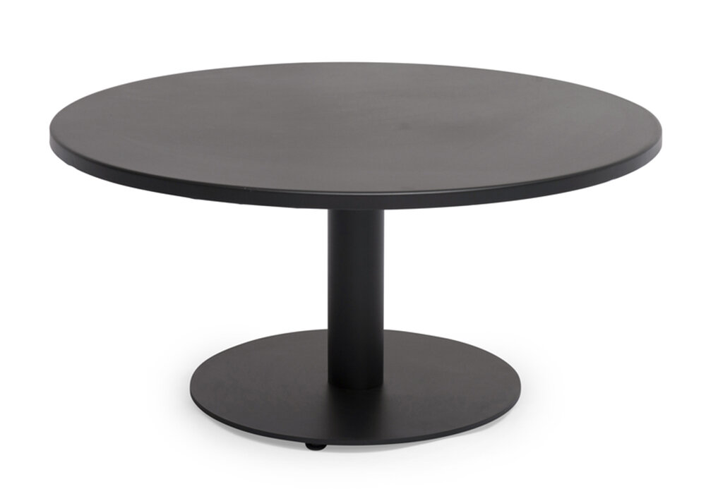 Ett runt elegant soffbord helt i lackad aluminium. Det svarta bordet passar till många olika grupper.