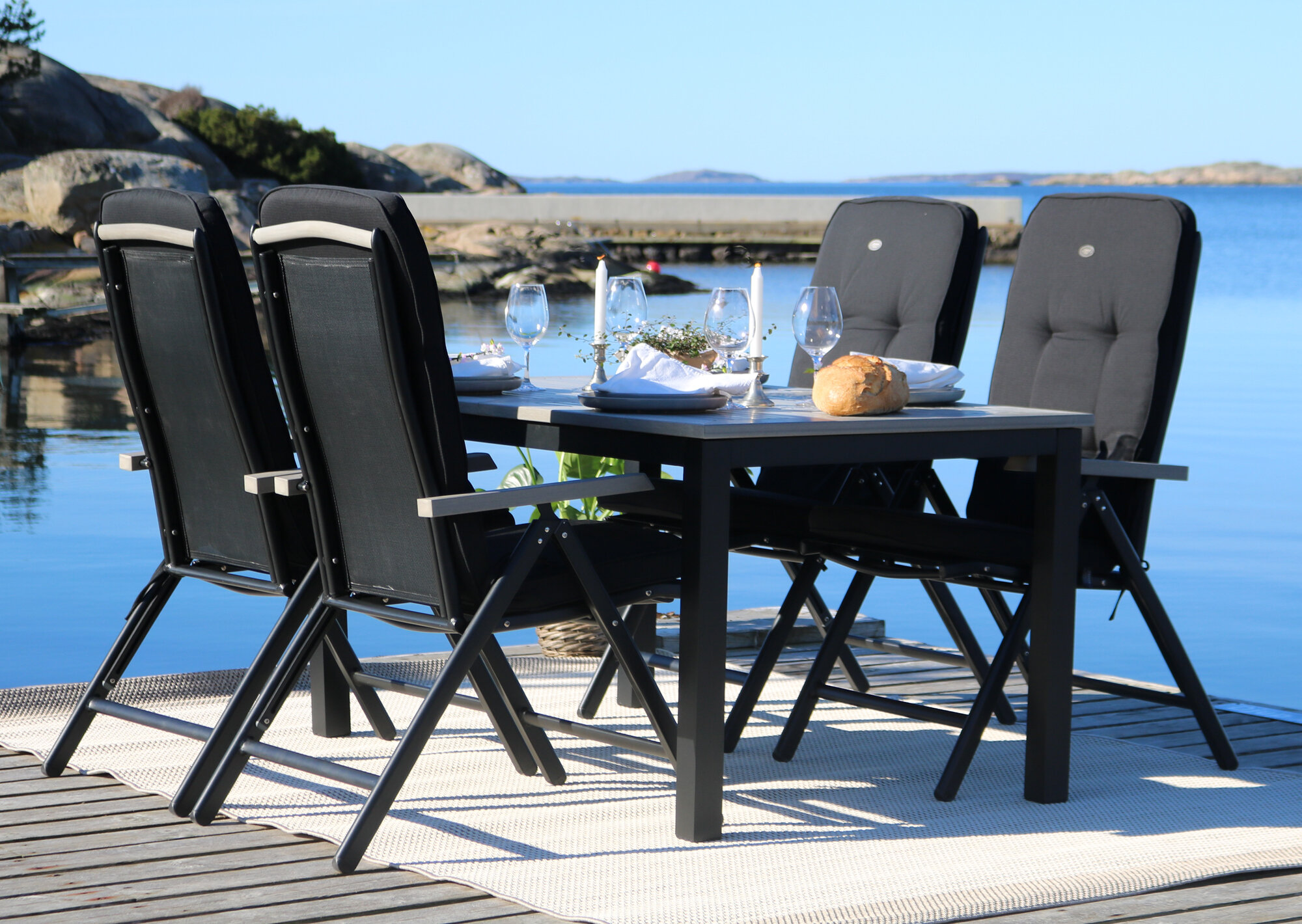Här i kombination med Baltimore Positionsstol. En nu mera klassisk modell på stol. Enkel att stuva undan, kan användas att luta sig tillbaka i och inte så tung som de gamla trästolarna från förr.