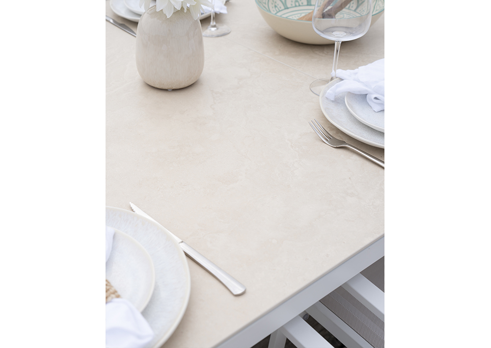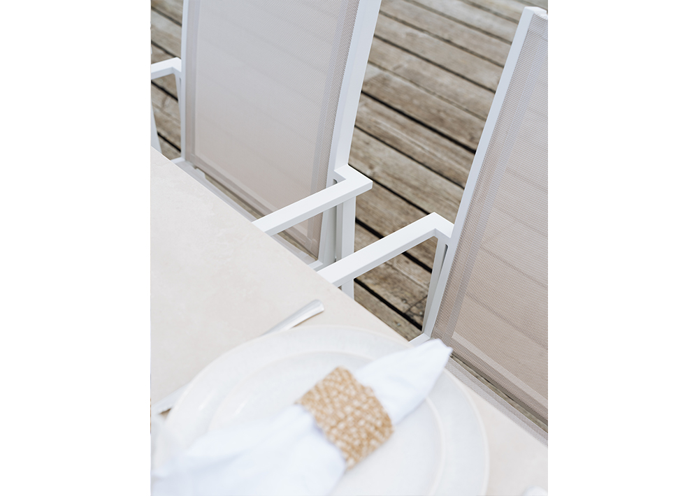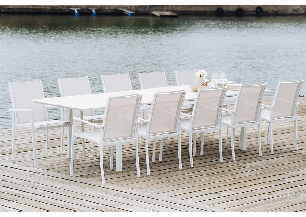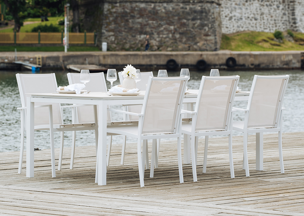 En matgrupp som erbjuder en underhållsfri möbel med bord och stolar i lackat rostfritt stål. Den keramiska skivan påverkas inte av sol och regn utan kommer att se fin ut många år frammåt.