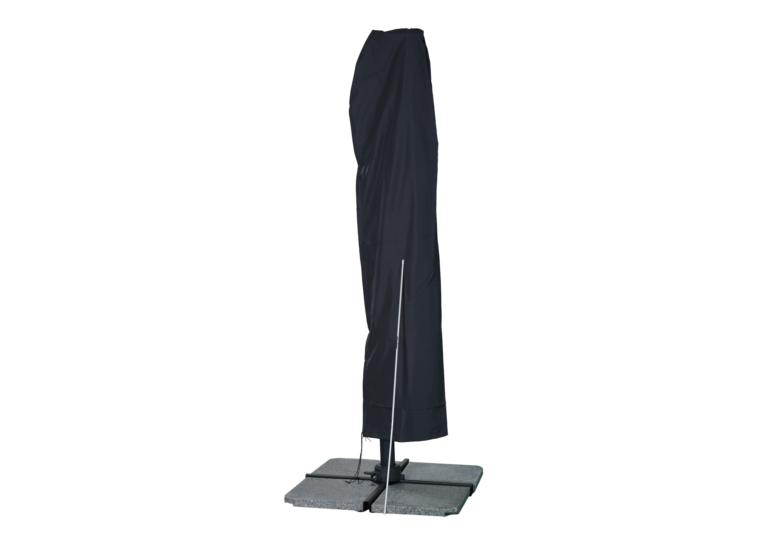 Parasoll som hänger fritt från sidan. Parasollet går att vinkla genom att föra handtaget upp och ner längs stolpen, det går även att snurra parasollet runt stolpen 360 grader.