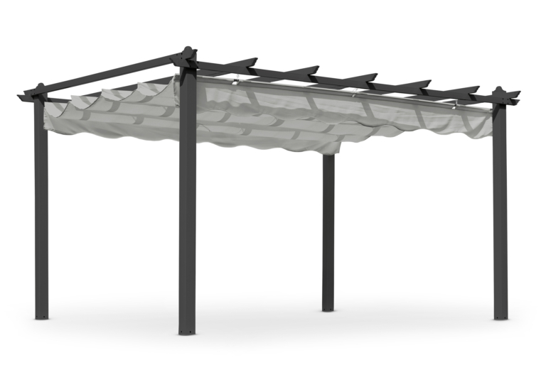Äntligen ett solskydd som täcker en grupp och som dessutom går att dra ifrån de dagar då solens strålar gärna får lysa på din uteplats.