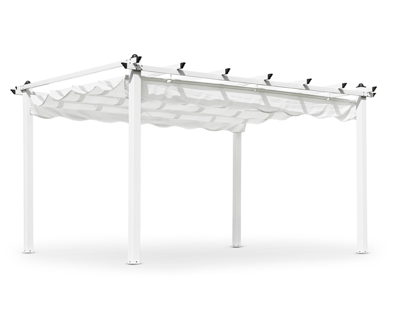 Äntligen ett solskydd som täcker en grupp och som dessutom går att dra ifrån de dagar då solens strålar gärna får lysa på din uteplats.