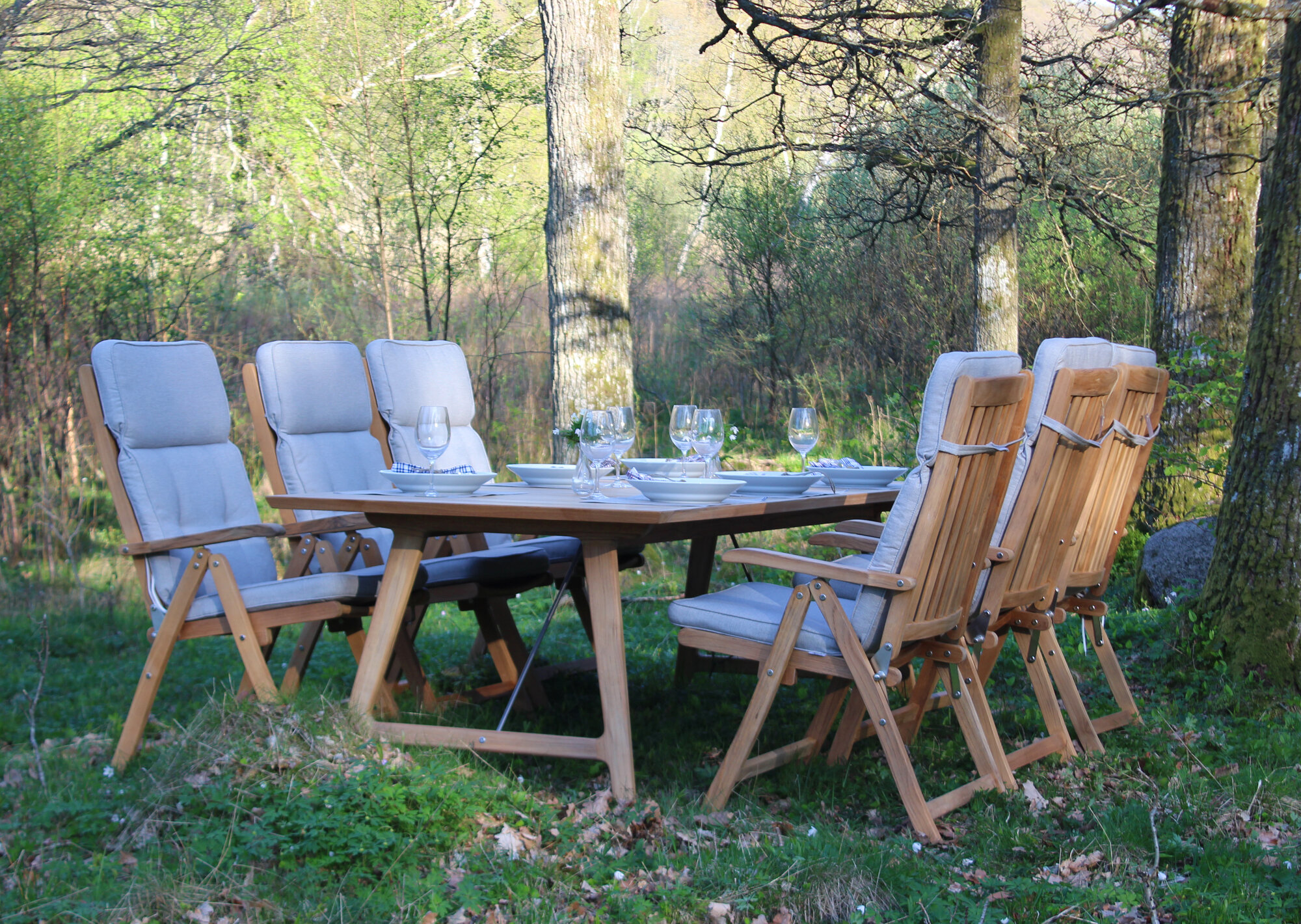 Här i kombination med Classic positionsstol som är en mycket välgjord positionstol med hög finish och bra material i både teaken och de rostfria delarna.