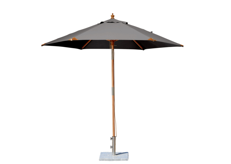 Ett praktiskt och snyggt parasoll i olefintyg. Olefin är mer motståndskraftigt mot blekning jämfört med polyester och rekommenderas av oss till parasoller med mörkare och färgstarka tyger. En gedigen och välbeprövad parasollkonstruktion. Parasollet vinklas enkelt med hjälp av en knapp, går att fälla åt två håll. Stocken är av brunt trä. Stolpen är 38 mm bred och tillverkad med hardwood.