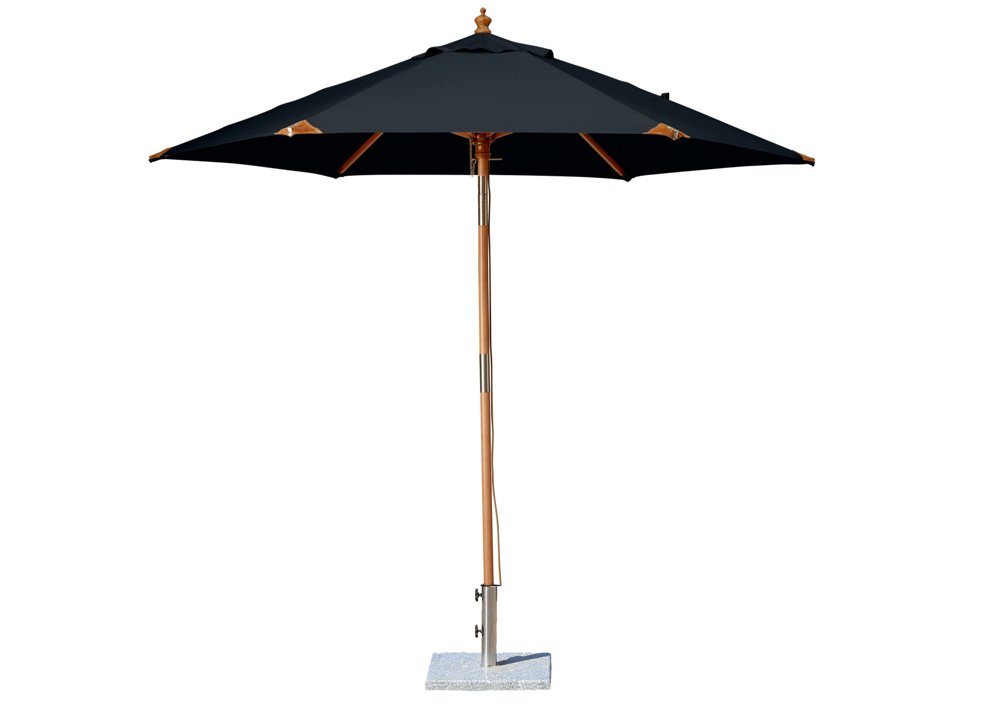 Ett praktiskt och snyggt parasoll i olefintyg. Olefin är mer motståndskraftigt mot blekning jämfört med polyester och rekommenderas av oss till parasoller med mörkare och färgstarka tyger. En gedigen och välbeprövad parasollkonstruktion. Parasollet vinklas enkelt med hjälp av en knapp, går att fälla åt två håll. Stocken är av brunt trä. Stolpen är 38 mm bred och tillverkad med hardwood.