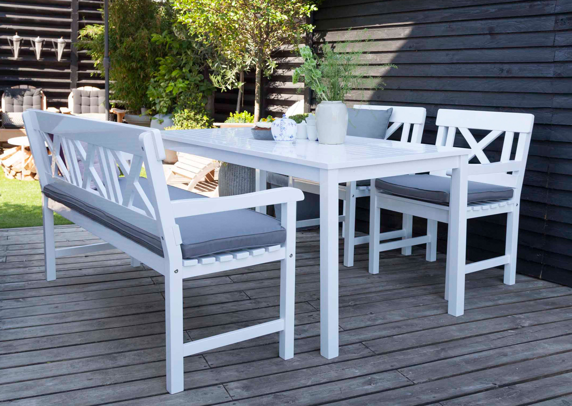 En enkel och snygg matgrupp i vitlackerad mahogny. Den vita färgen är målad med PU high glossy paint. Dansk design från Cinas. Delar går att köpa separat. Gruppen består av en 3-sits soffa, två fåtöljer och ett bord.
