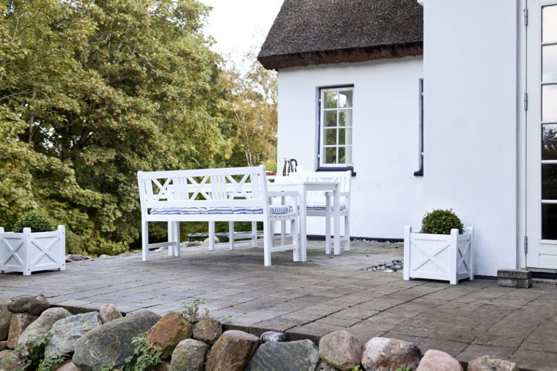 En enkel och snygg matgrupp i vitlackerad mahogny. Den vita färgen är målad med PU high glossy paint. Dansk design från Cinas. Delar går att köpa separat. Gruppen består av en 3-sits soffa, två fåtöljer och ett bord.