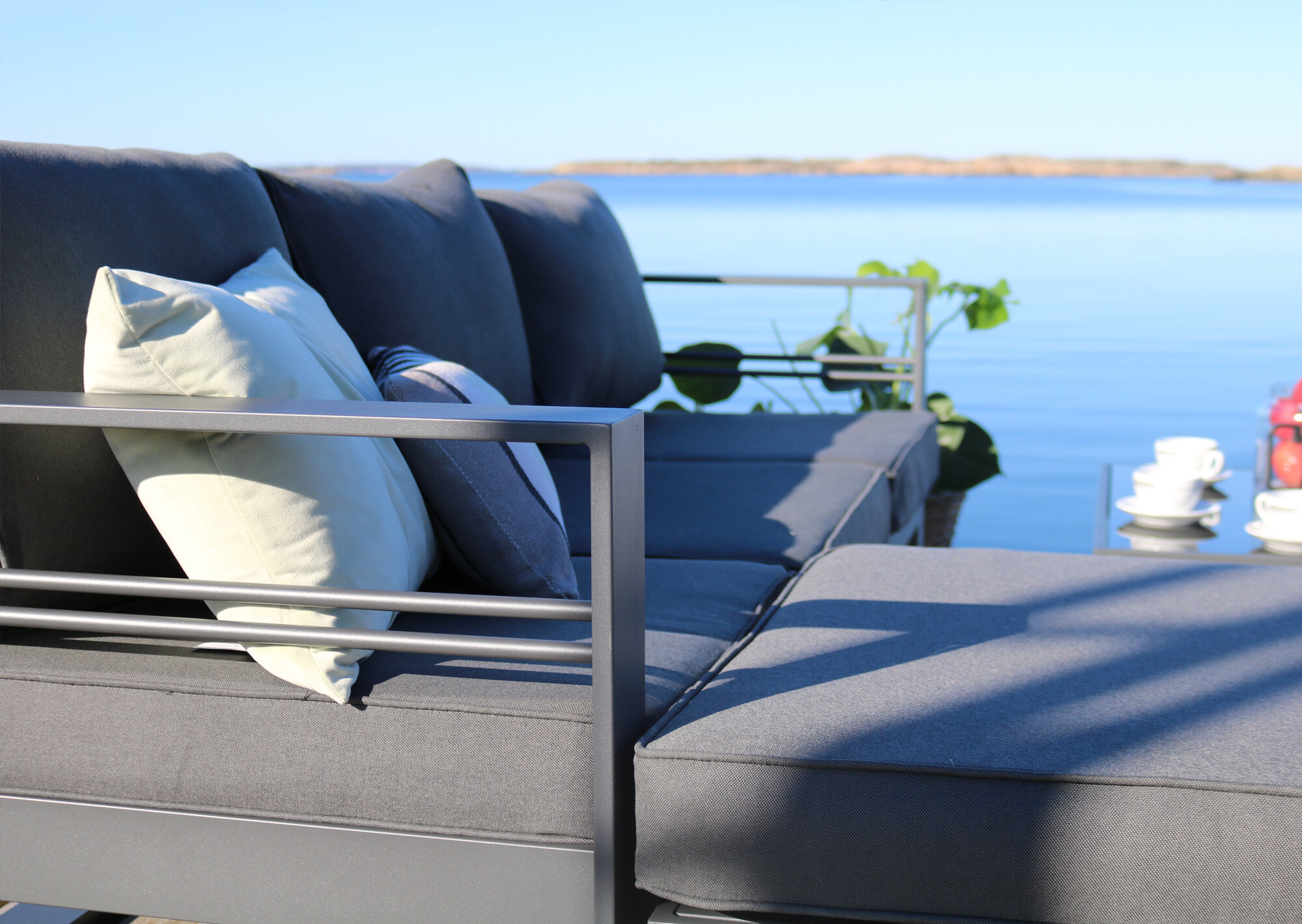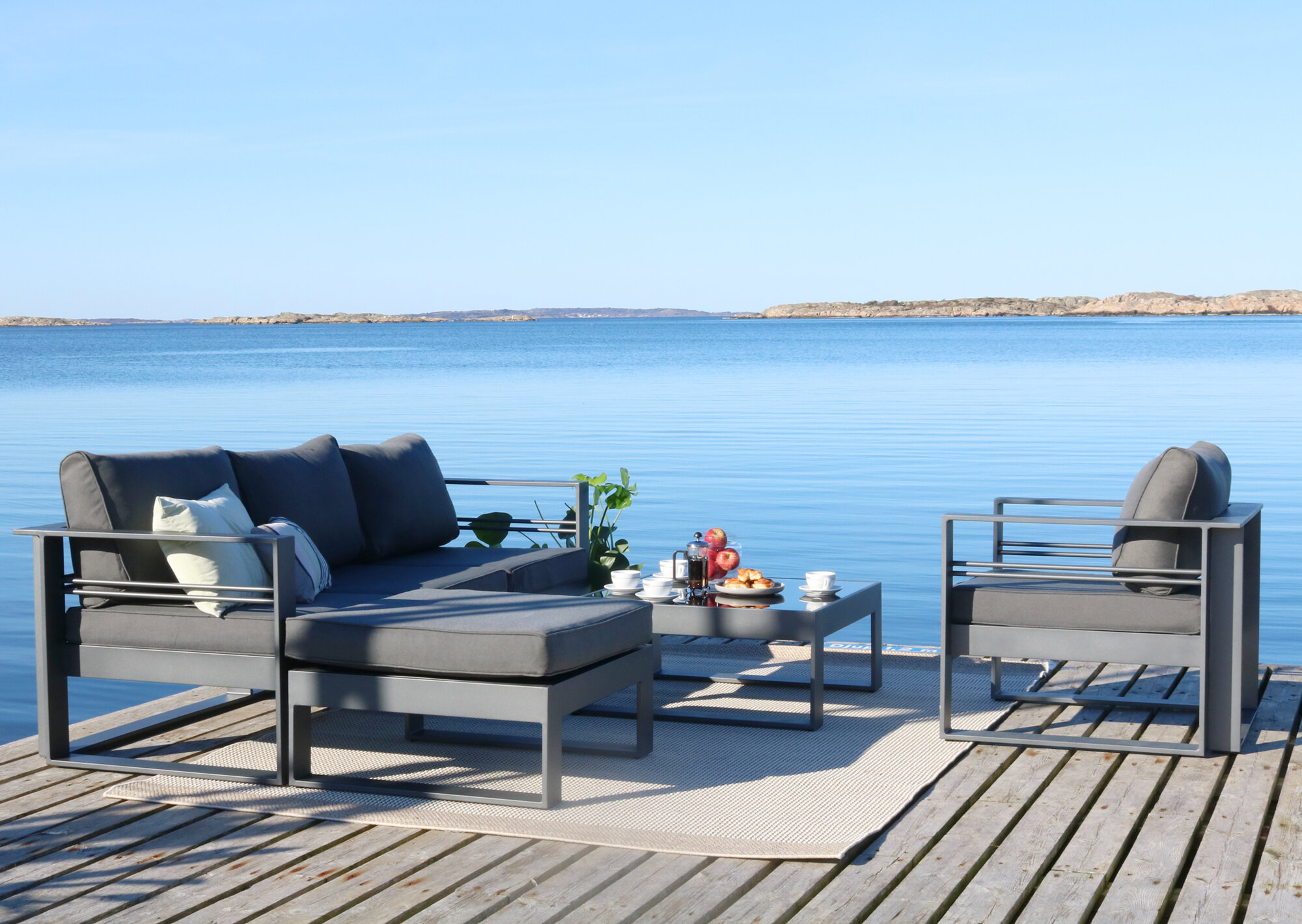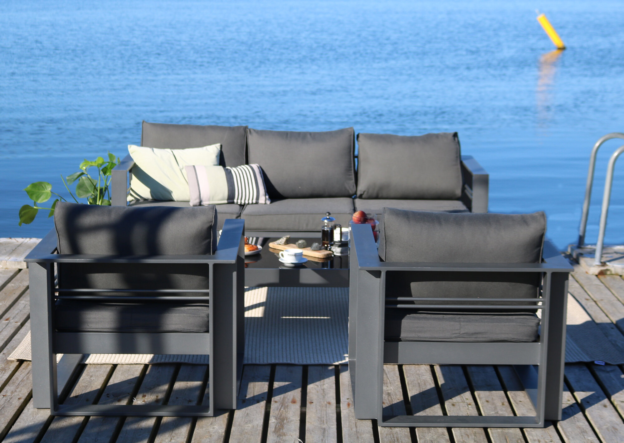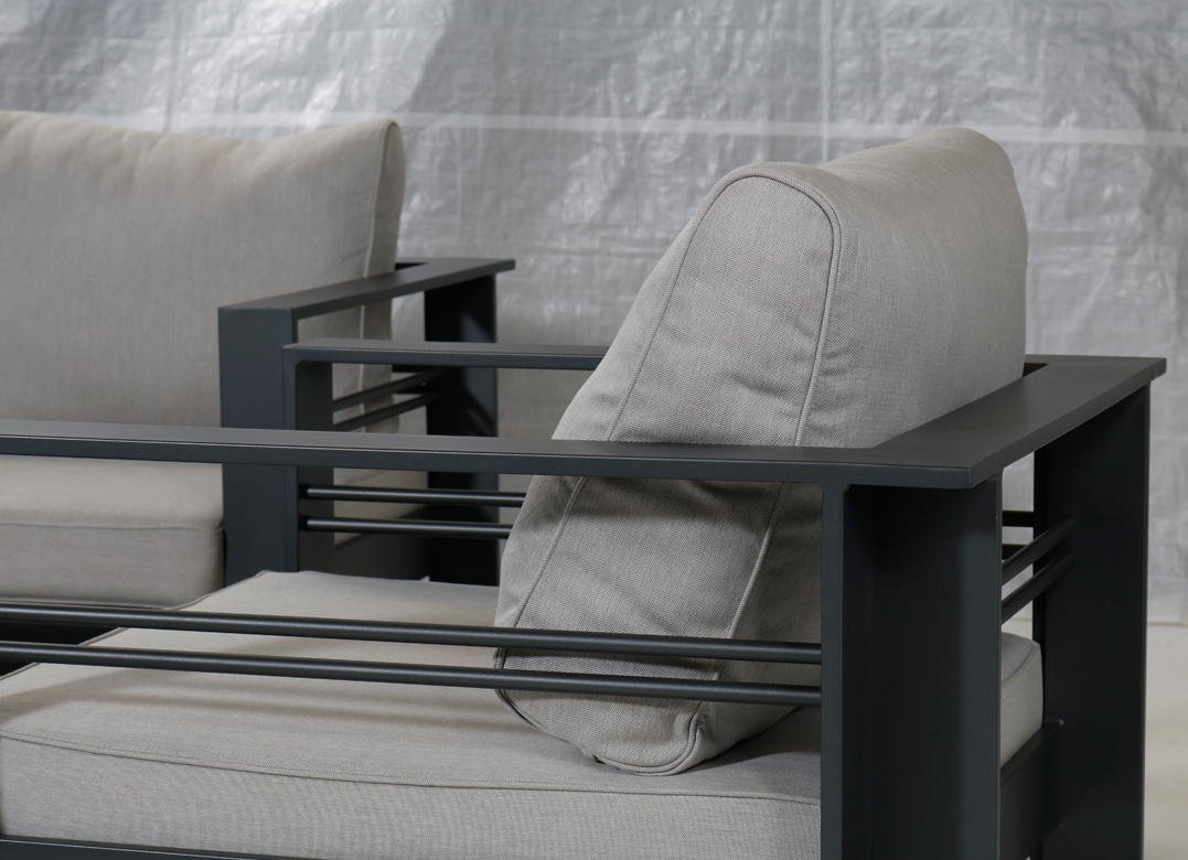 Lyxig stilren loungegrup i lackad aluminium. En rejäl grupp med väl tilltagna dimensioner för en mycket god sittkomfort. Den matt antracitfärgade lacken ger ett något mjukare intryck än en helt svart lack, vilket ofta upplevs som behagligt.