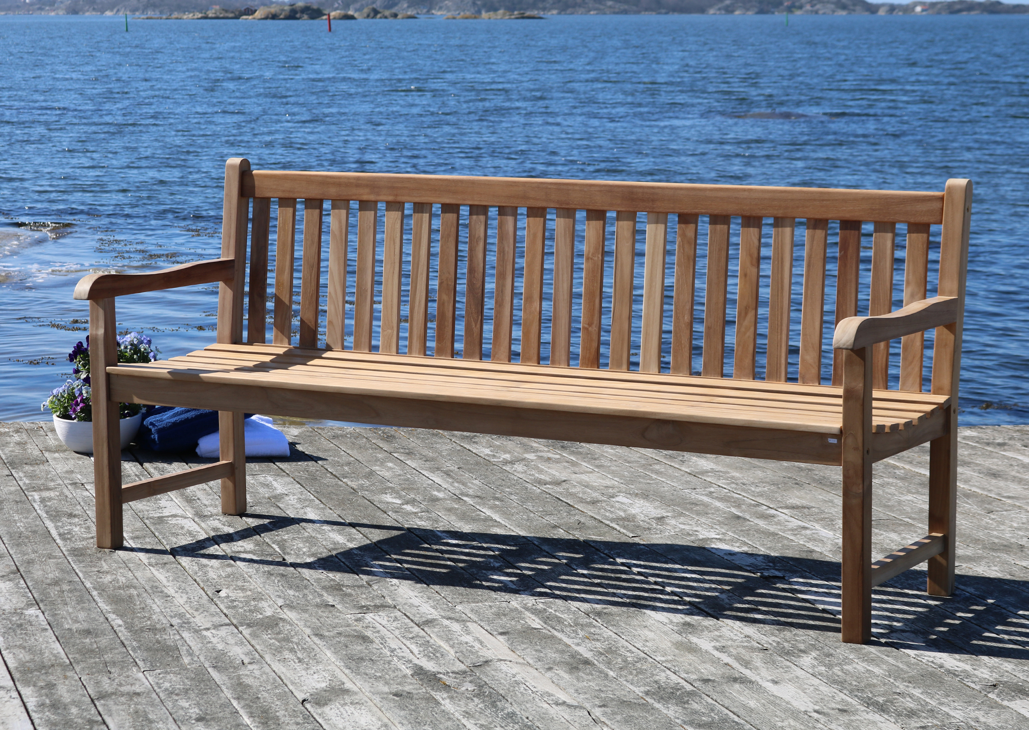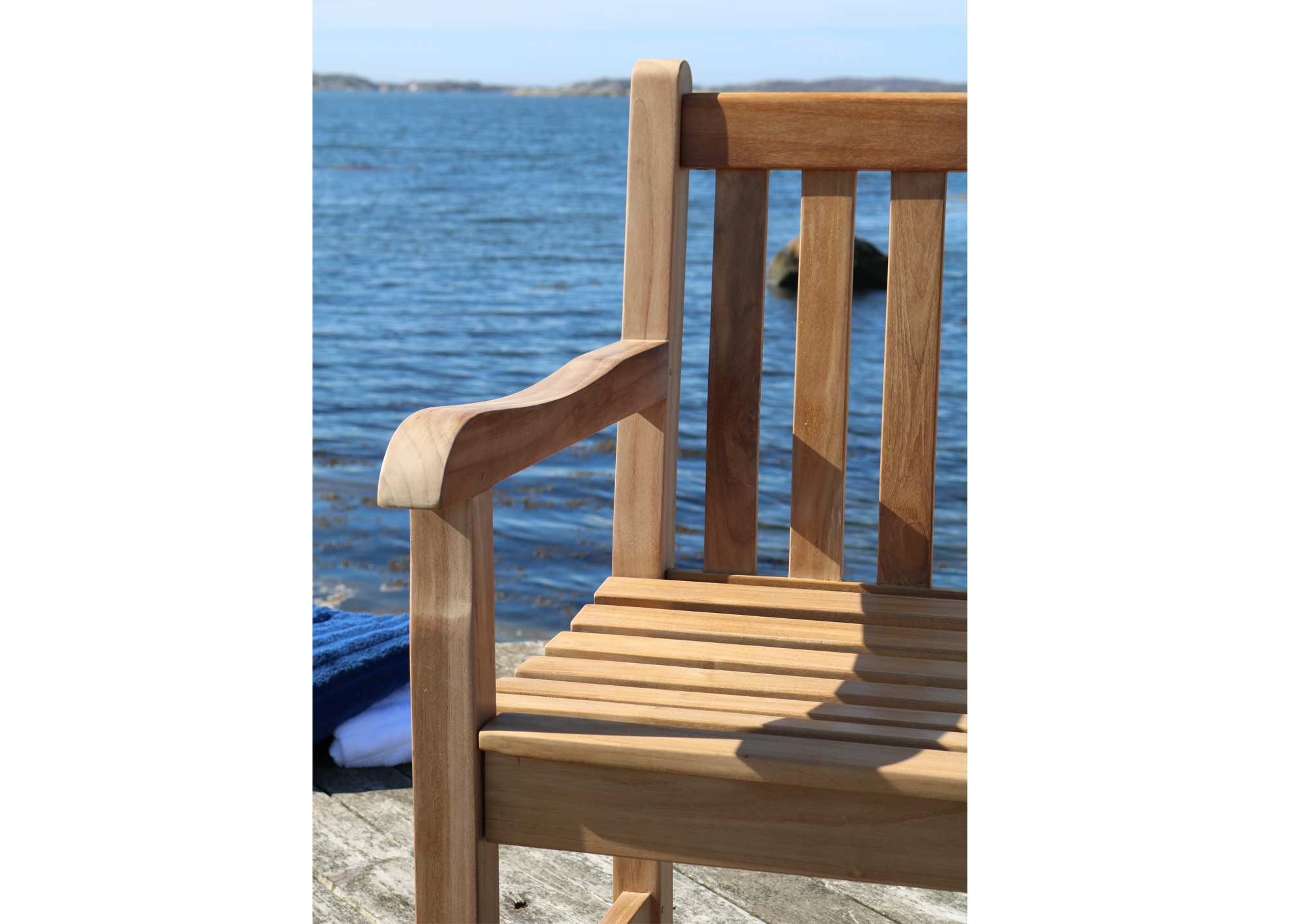 En rejäl teakbänk. En bänk som passar både som solitär och vid matgruppen. Här får det plats många, det går alltid att knö sig ner en till på en soffa, finns det hjärterum så finns det stjärterum