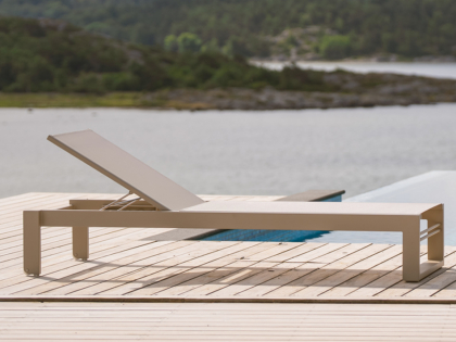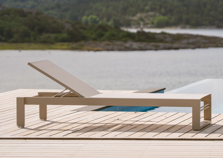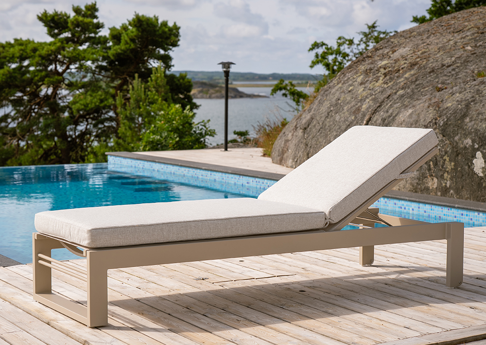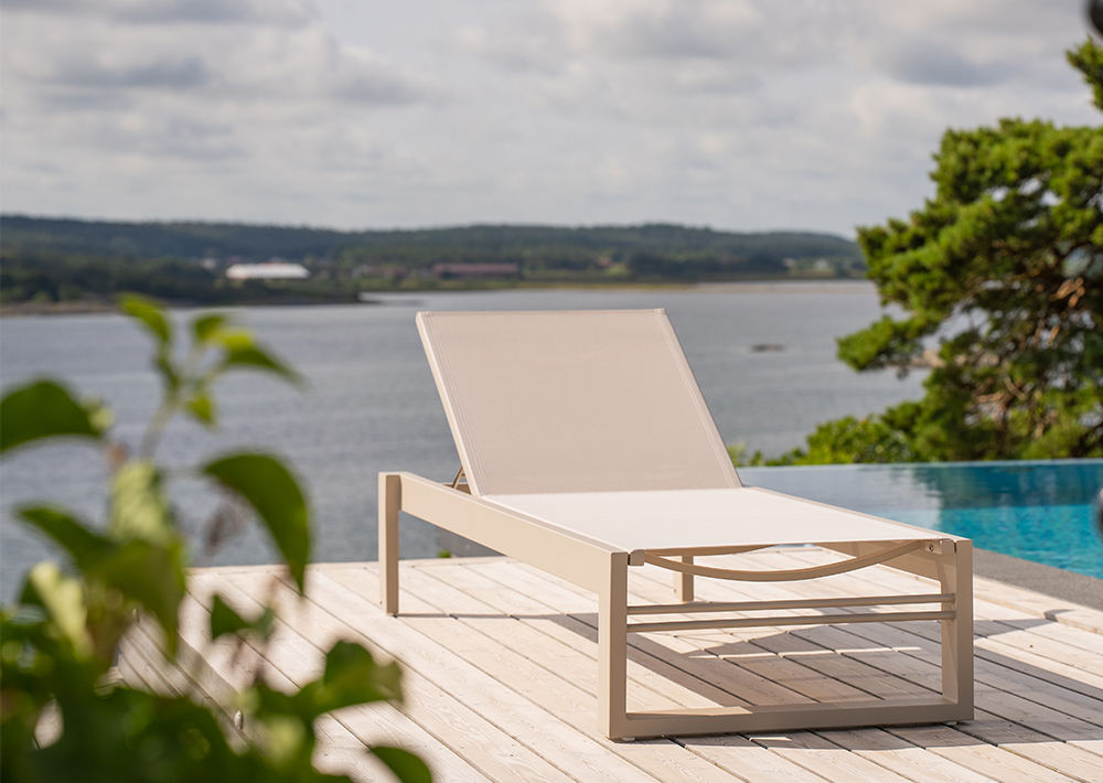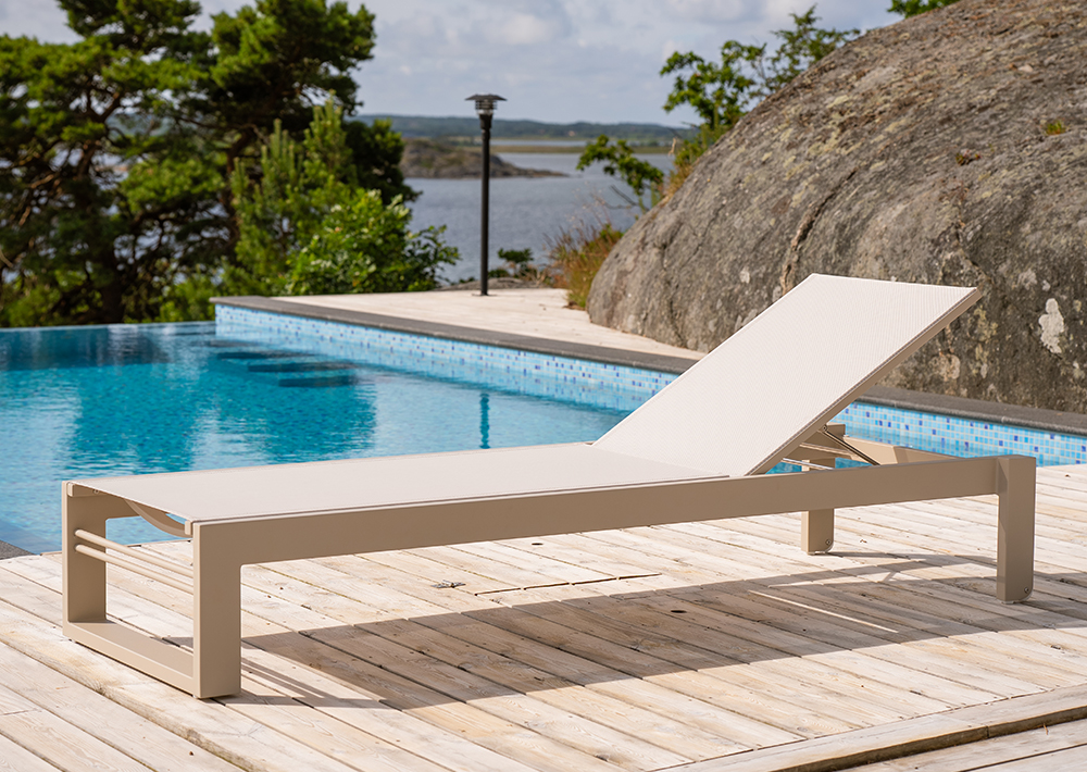 Stilren solsäng med raka linjer. Ger en modern, somrig och fräsh känsla på din uteplats. Med den grå väven får du en lättskött solsäng.