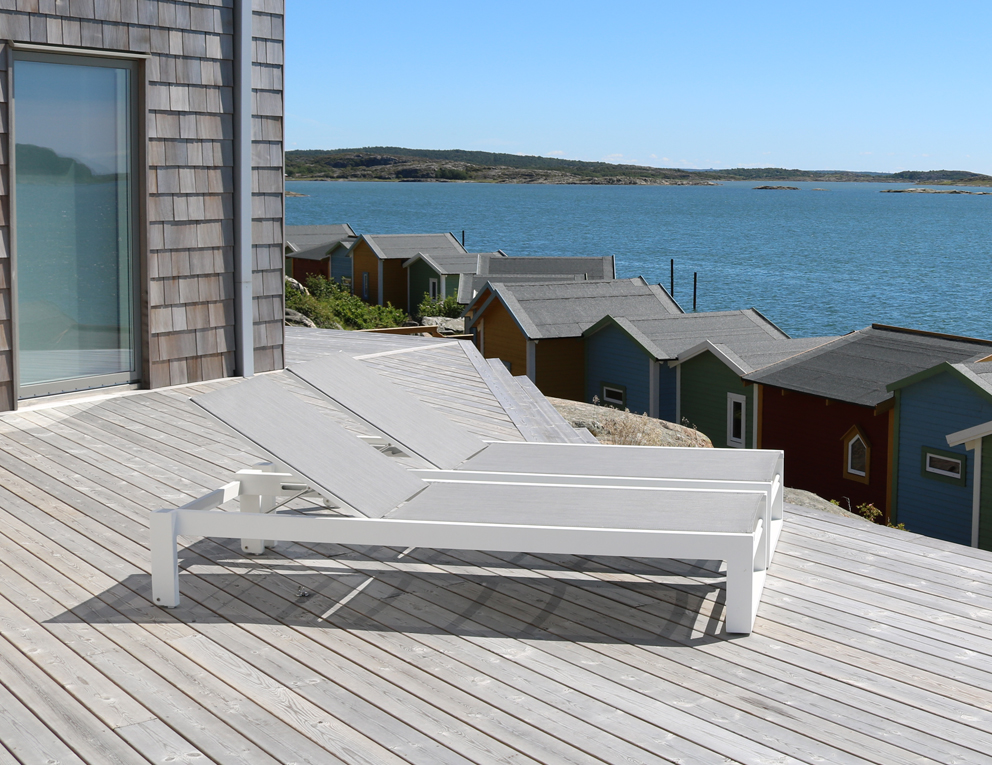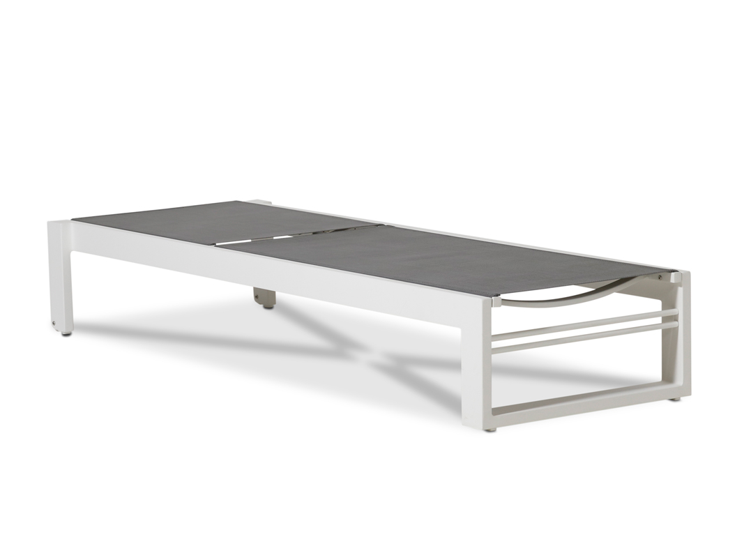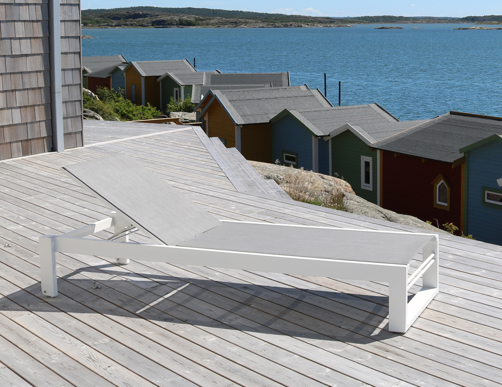 Stilren solsäng med raka linjer. Ger en modern, somrig och fräsh känsla på din uteplats. Med den grå väven får du en lättskött solsäng.