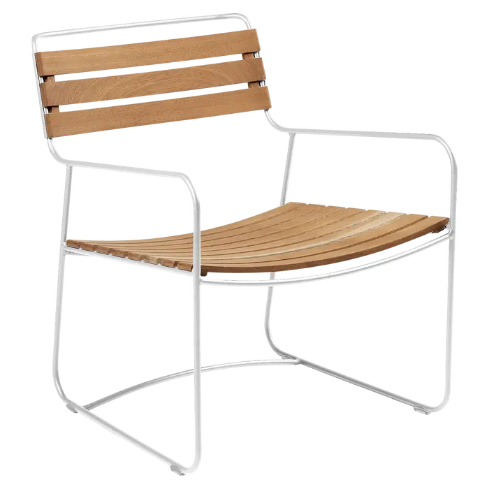 Den låga trädgårds fåtöljen Surprising fångar perfekt all charm i denna kollektion: naturliga teak ribbor, en designad stålstångs ram och ergonomi utformad för maximal komfort. Denna kombination av robust metall och varmt trä sammanfattar perfekt Fermobs material expertis och deras strävan att bredda sitt sortiment. Resultatet är en djärv, mycket modern utomhus möbel med en ram som finns i alla 24 nyanser av färgkartan, kombinerat med teakens elegans. En låg fåtölj i metall och trä som folk kommer att älska både inomhus och utomhus.